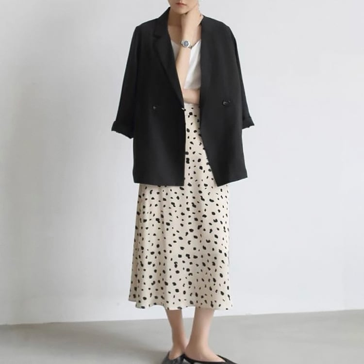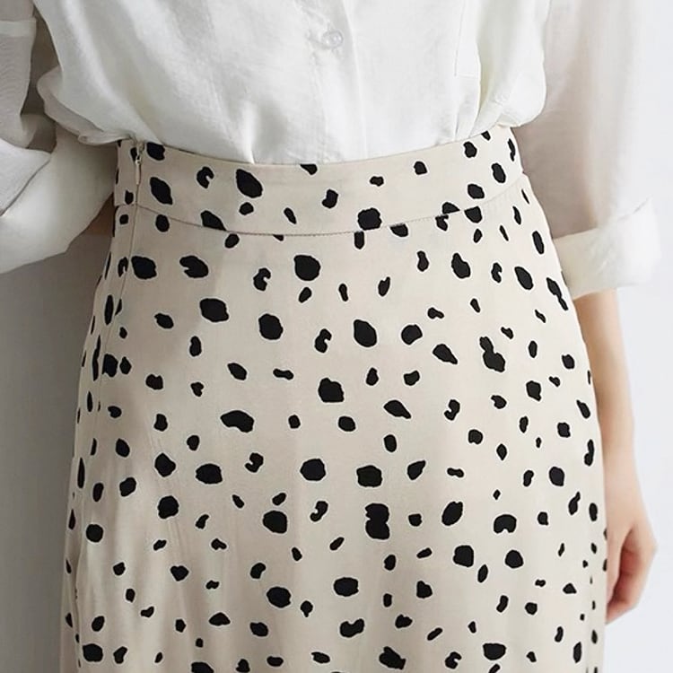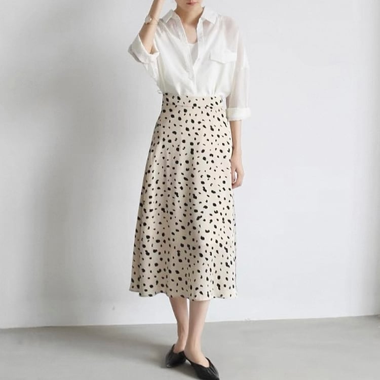 フレアシルエットと、ダルメシアン柄が目を引く、ミモレ丈Aラインスカート。ハイウエストデザインで脚長効果も抜群。ダルメシアン柄が程よいアクセントになり、シンプルなトップスも一気に華やかに。オフィスからデートまで幅広いシーンで活躍してくれる、フェミニンなのに甘すぎないアイテムです。