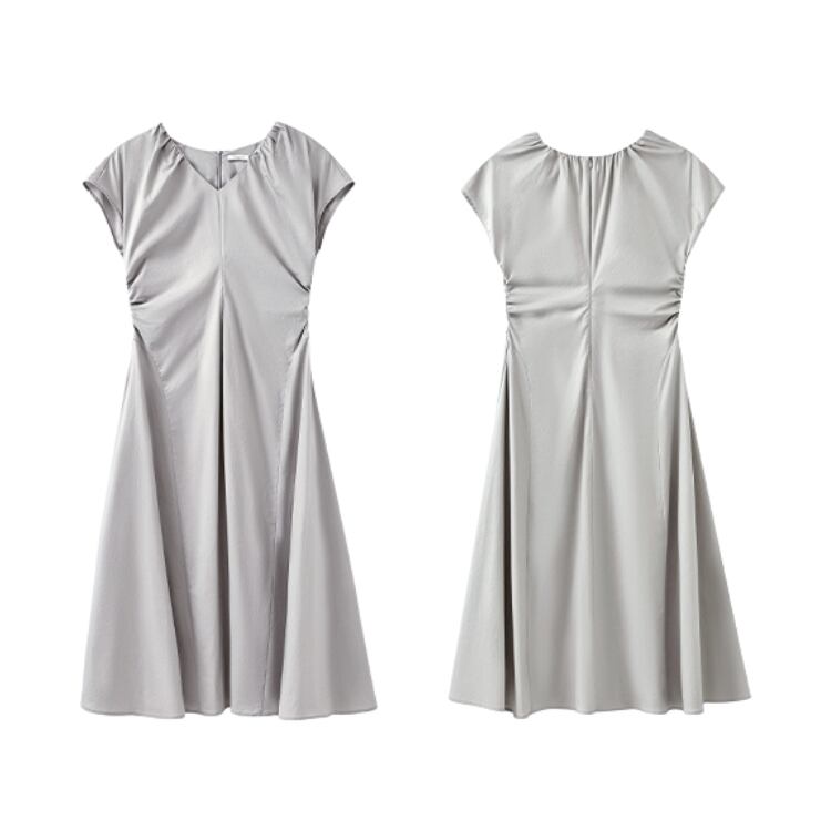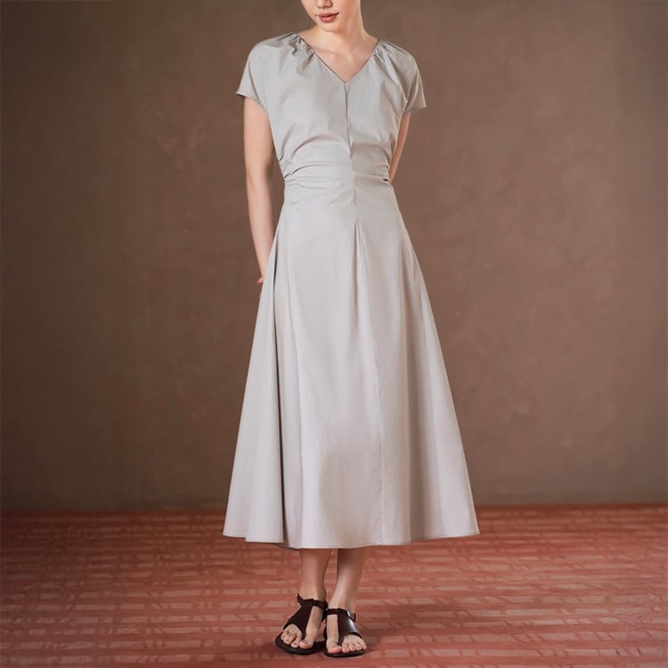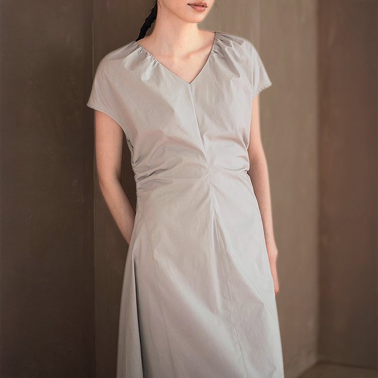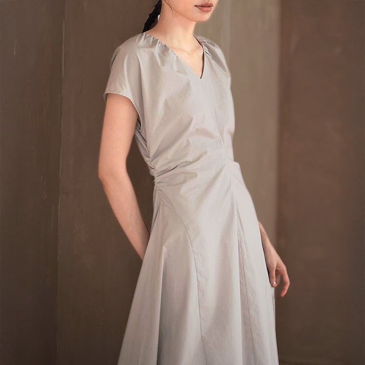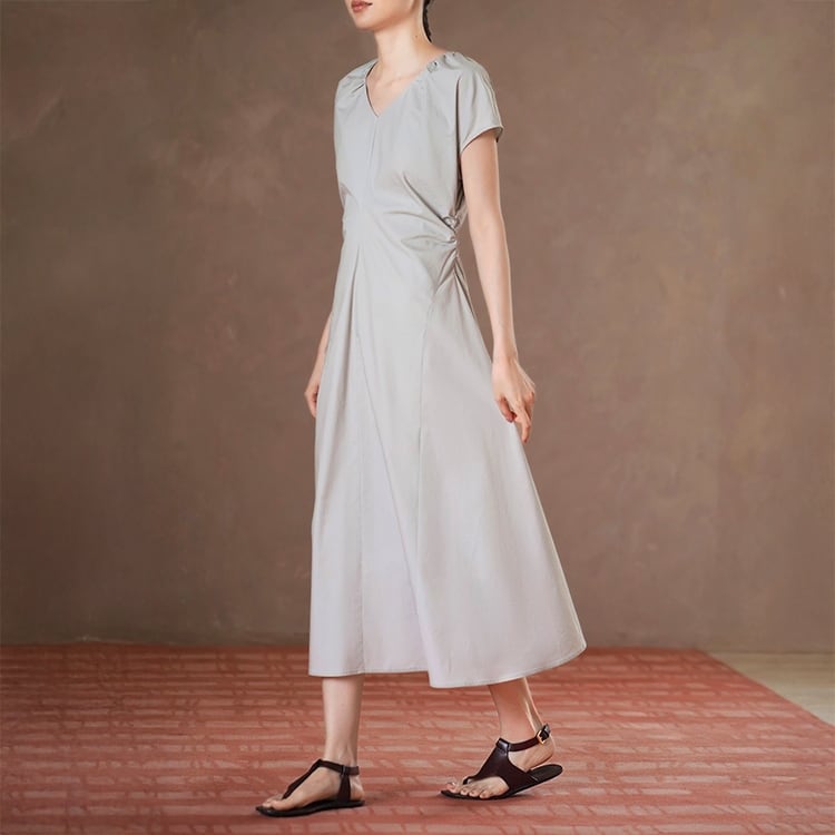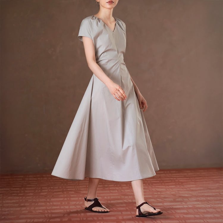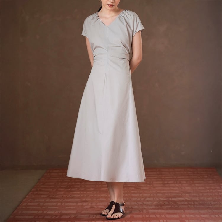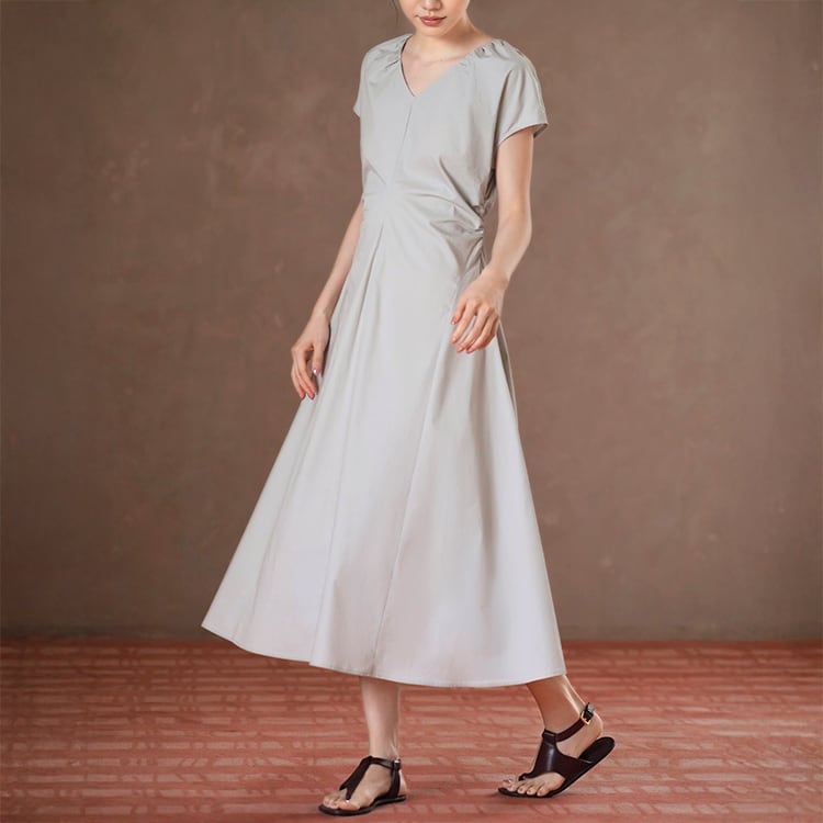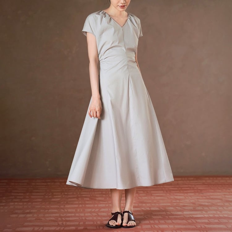 Vネックとサイドのギャザーデザインが、一際目を引くフレアワンピース。立体裁断がスタイルアップ効果と、スカートの広がりのあるドレープ感が美シルエットを演出。シンプルながらも、女性らしい大人の魅力を引き立ててくれる一着です。