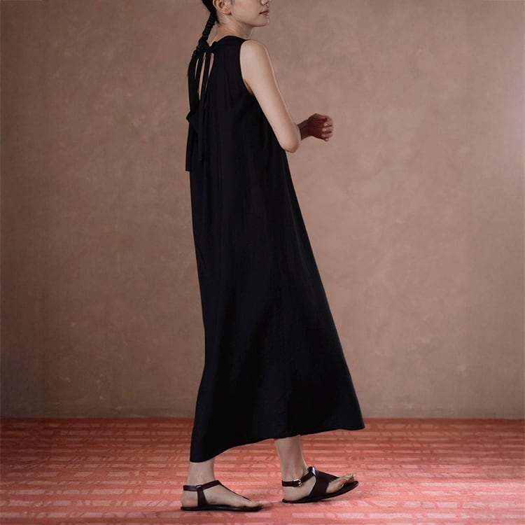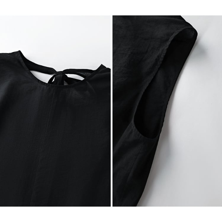 フロントはすっきりとしたラウンドネックのミニマルデザイン、マキシ丈のノースリーブワンピース。Aラインシルエットで、さりげなく体型カバーも叶い、背中の開きすぎないレースアップが絶妙なバランスで、大人の抜け感を演出。デイリー、お出かけスタイルに映える一着です。