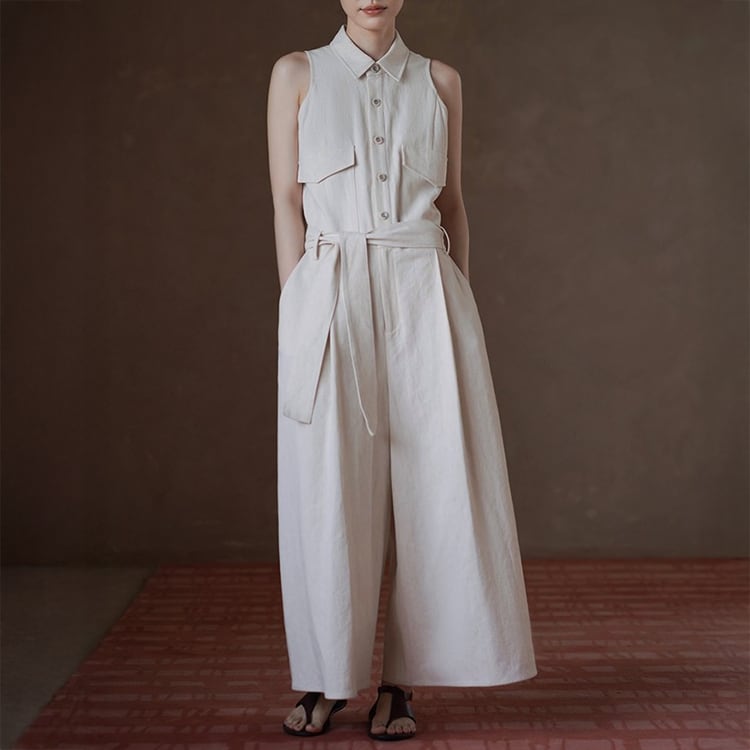 ナチュラルな風合いの素材で仕立てたスリーブレスオールインワン。シャツライクなトップとリラックス感のあるワイドパンツの組み合わせで、知的さと柔らかさを兼ね備えたスタイルを演出。またウエストの共布ベルトを結ぶだけで、女性らしいシルエットに。デイリーからオフィスカジュアルまで幅広く使える一枚です。