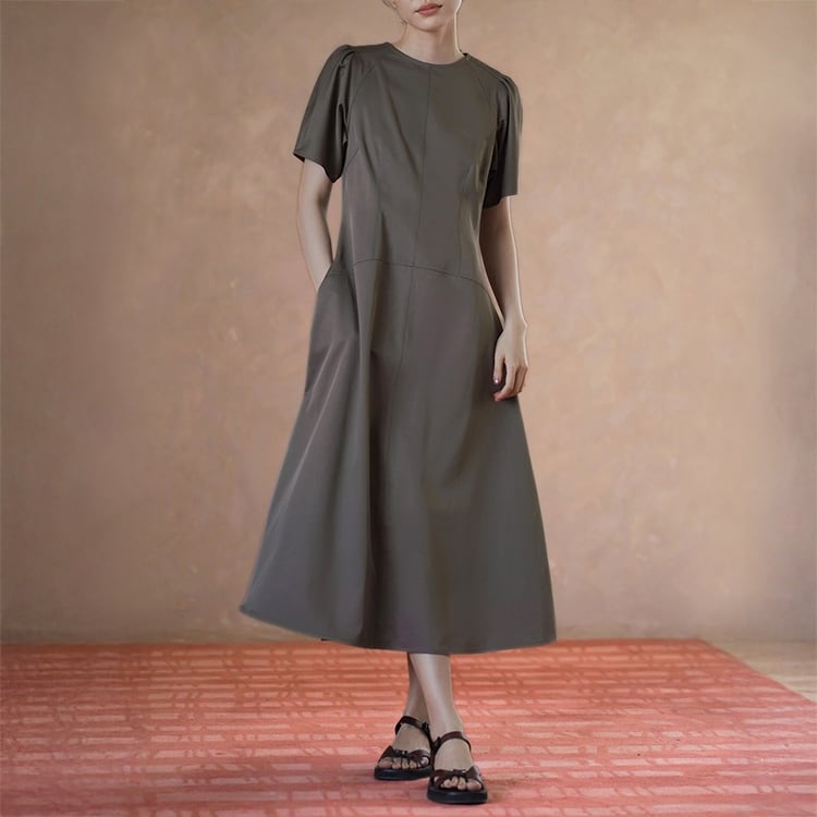 肩に施されたプリーツとパフスリーブが、女性らしい柔らかさを引き立てるAラインワンピース。後ろ姿はリボン結びのディテールで、女性らしさを際立たせます。落ち着きのある素材感と色味で、デイリーからオケージョンまでエレガントに映える一着です。