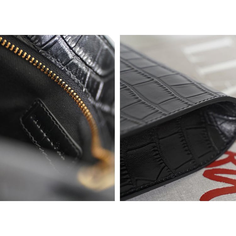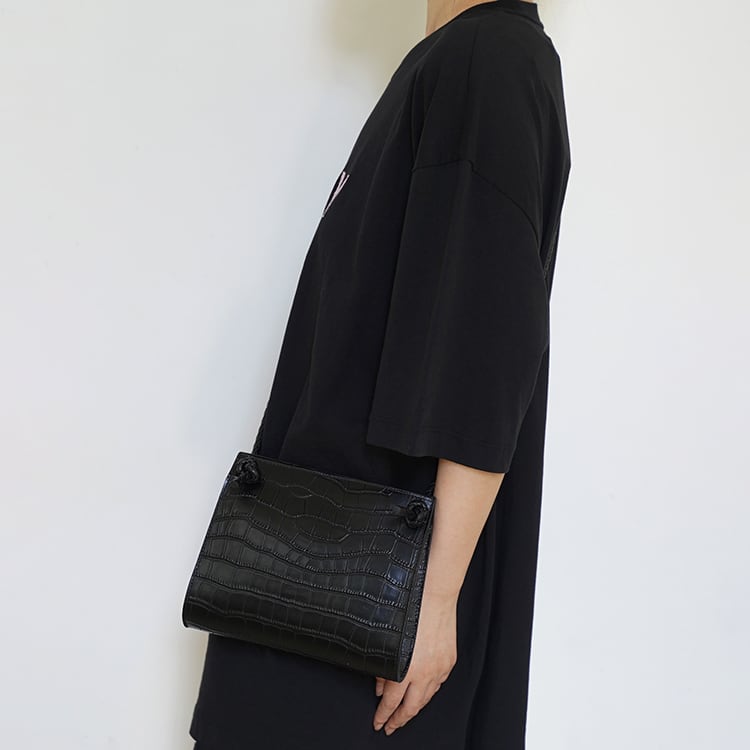 高級感あふれるクロコダイル型押しのレザーを使用したショルダーバッグ。程よい艶感とフォルムが洗練された大人の余裕をプラス。ショルダーでスタイリッシュに、斜め掛けでカジュアルに、シンプルなコーディネートを格上げしてくれるアイテムです。