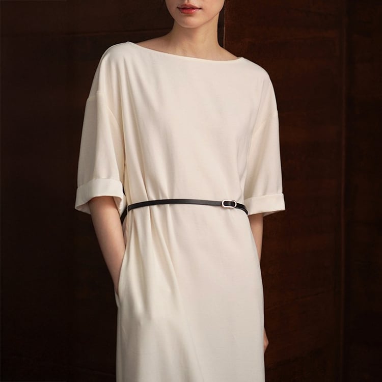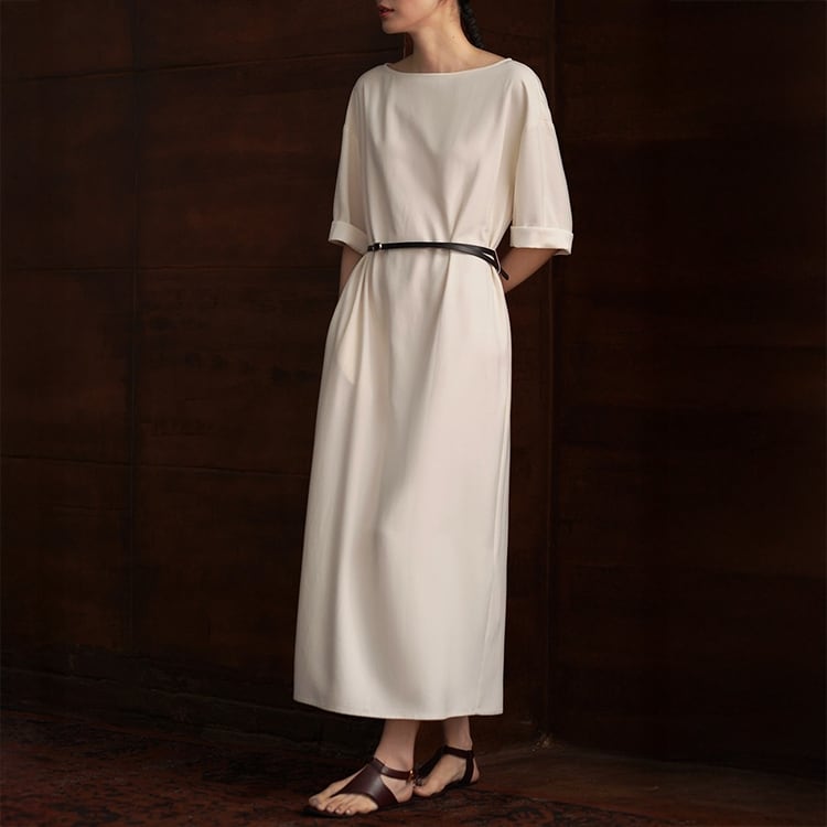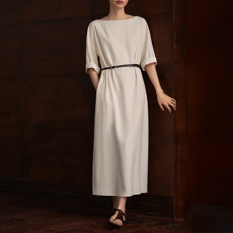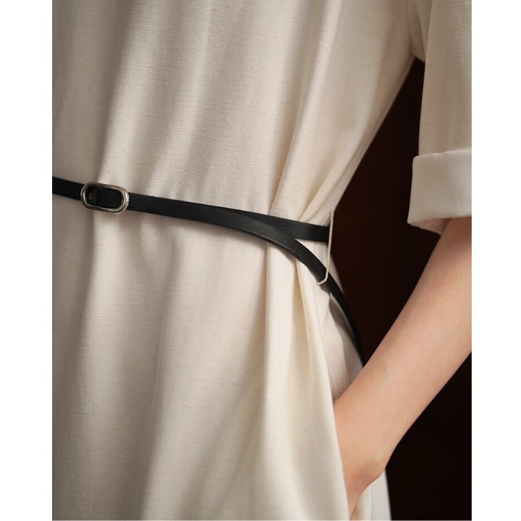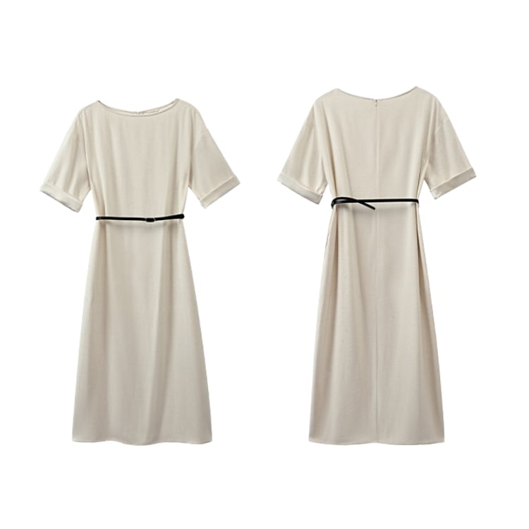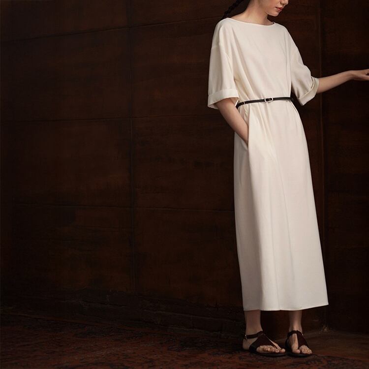 ボートネックのデザインが、女性らしさを引き立てる、リネンブレンドワンピース。ゆったりとしたシルエットで体型をカバーしつつ、付属のベルトで引き締めてバランスよく着こなせます。ミニマルな装いの中に女性らしさを引き出してくれる一着です。