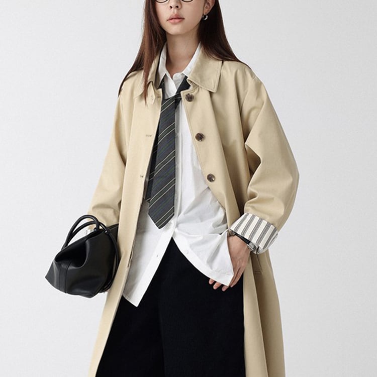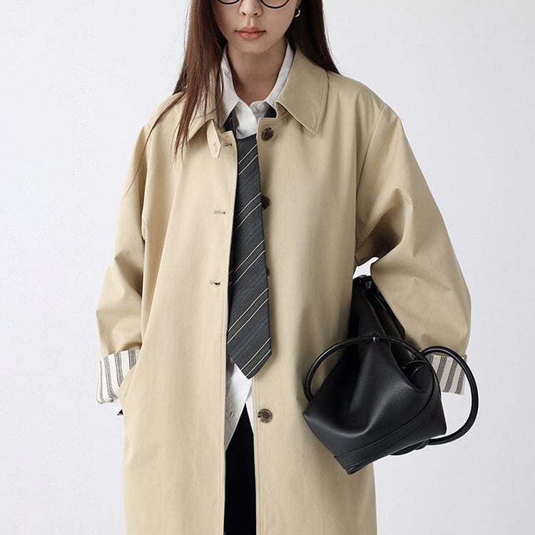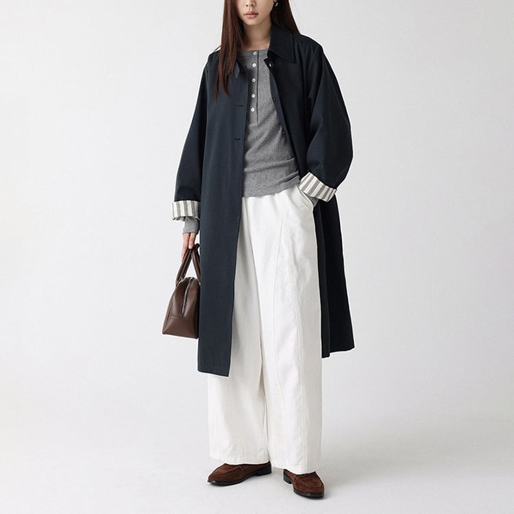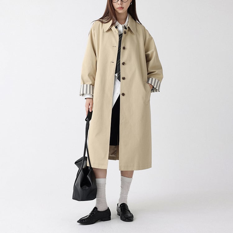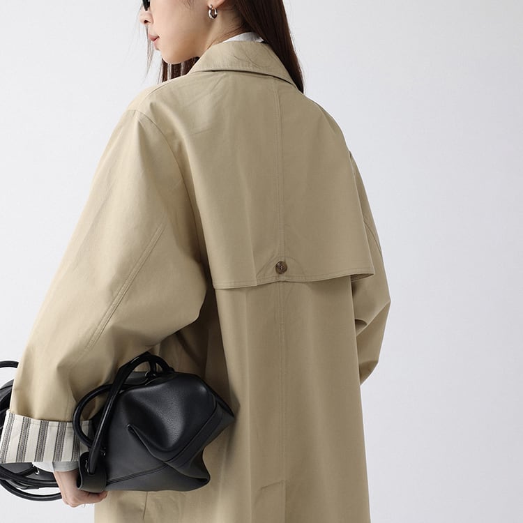 洗練された大人の雰囲気を演出するステンカラーコート。袖口を軽くロールアップすれば、裏地のストライプ柄がより際立ち、こなれた雰囲気を演出。特別な日にはもちろん、通勤スタイルや買い物といった何気ない日常のシーンでも、スタイリングを格上げしてくれるアイテムです。 【サイズ】 M:肩幅45cm / バスト127cm / 袖丈56cm / 袖口33cm / 裾126cm / 着丈108cm L: 肩幅46cm / バスト131cm / 袖丈57cm / 袖口34cm / 裾130cm / 着丈109cm *モデル身長168cm(Lサイズ着用) 【カラー】 ベージュ / ネイビーブルー 【素材】 コットン100% 【注意事項】 ・タイミングによっては商品在庫切れにより、注文キャンセルとさせていただく恐れもございますので、予めご了承くださいませ。 ・こちらは輸入品となります。日本製とは検品基準が異なる為、新品未使用品でもごくわずかな汚れやほつれがある場合もございます。 ・仕入れ工場を変えることがあるため、記載サイズと若干異なる場合がございます。 ・商品の色味は、お手持ちのスマートフォン画面によって実物と若干異なる場合がございます。 ・イメージ違いやサイズ交換等、お客さまご都合による交換、返品は対応出来かねます。 ■選べるお支払い方法 ・クレジットカード決済(VISA/Master/JCB/AMEX) ・Amazon pay ・キャリア決済(docomo/au/Softbank/Y!mobile) ・あと払いPayID ■お届けについて こちらの商品は海外店舗より直接発送となる為、 ご入金から10日~3週間前後での発送となります。 ↓ご購入前にこちらをお読みください https://closetly.shopselect.net/about