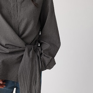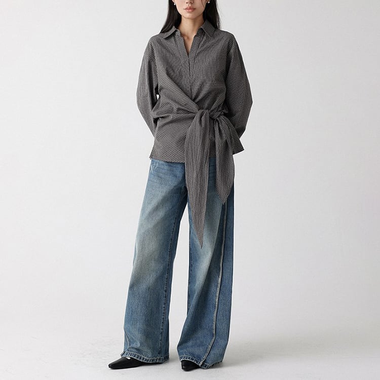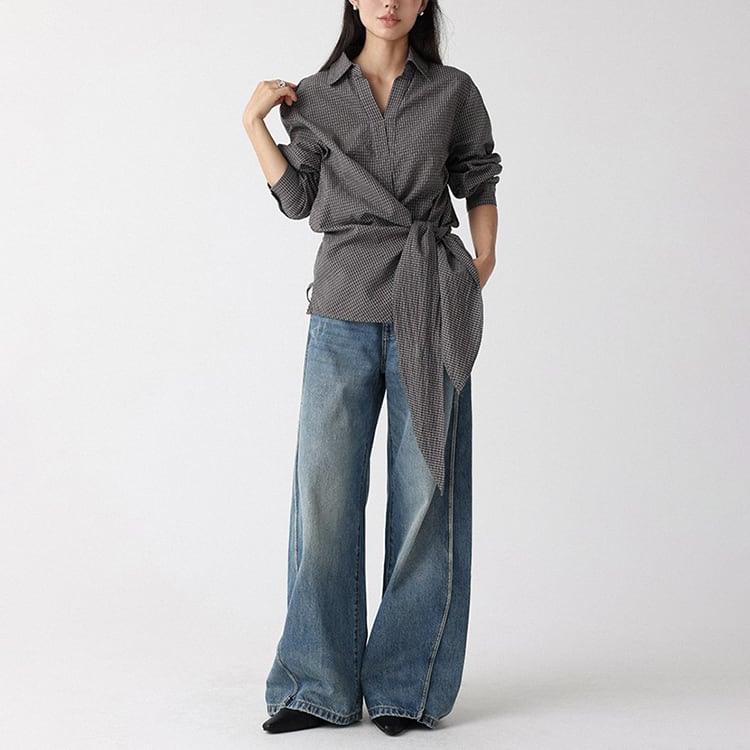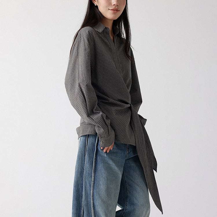 程よく開いたVネックがデコルテを美しく見せ、抜け感を演出するクラシカルなチェック柄ブラウス。ウエスト部分のリボンは前でも後ろでも結べるので、着こなしに変化をつけられます。シンプルなコーデをワンランク上に仕上げ、一枚で主役になるアイテムです。