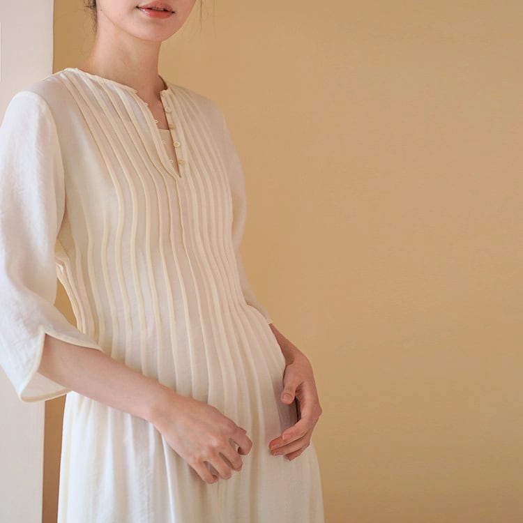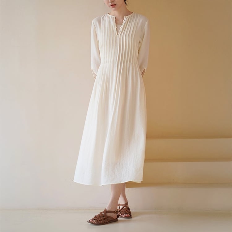 シンプルながらもクラシカルな印象のピンタックデザインのワンピース。タックデザインが、縦ラインを強調し、シルエットに奥行きを与え、ペタルスリーブの七分袖が女性らしい抜け感を演出。着るだけで清楚な雰囲気をまとえる一着です。
