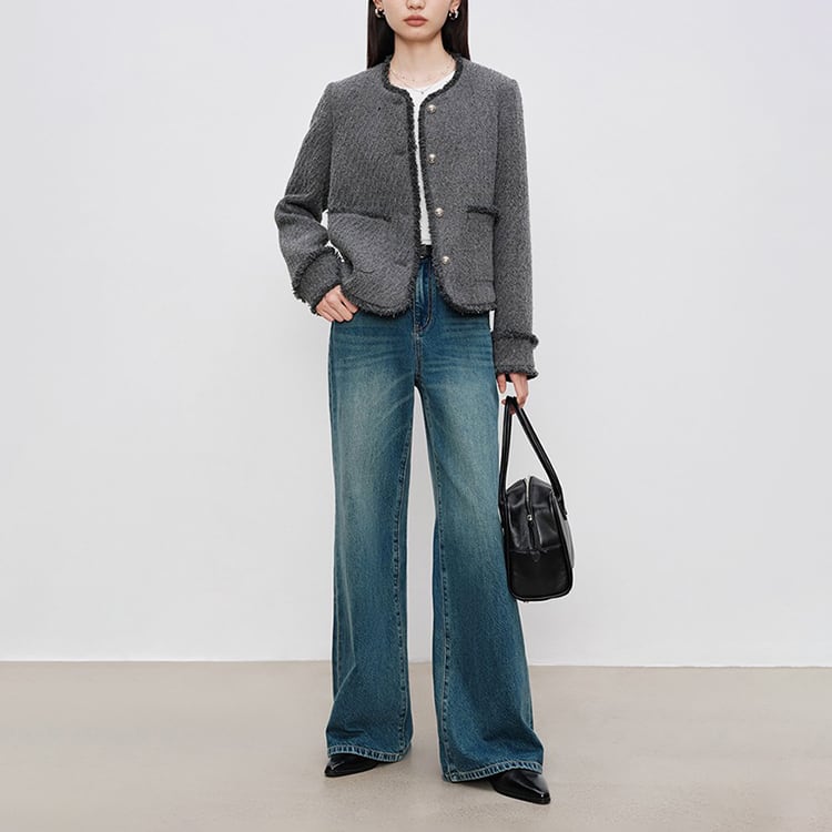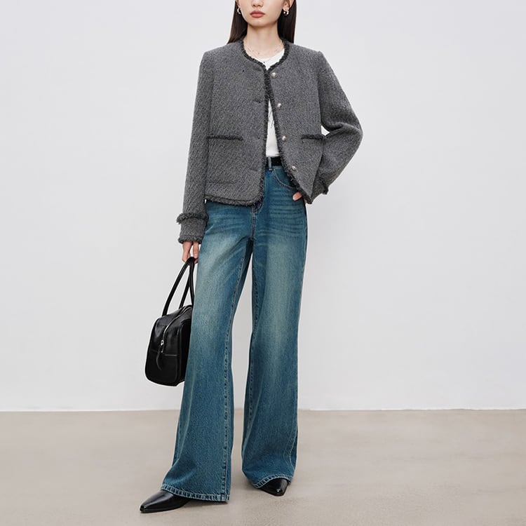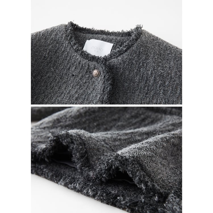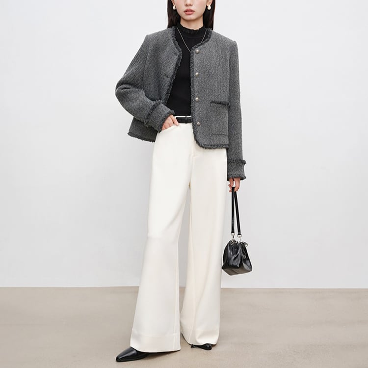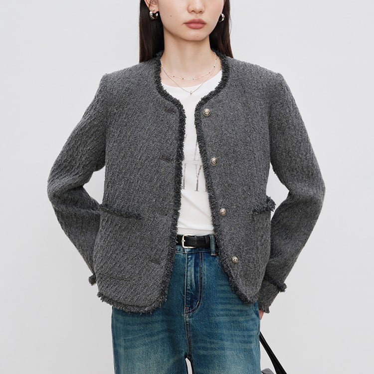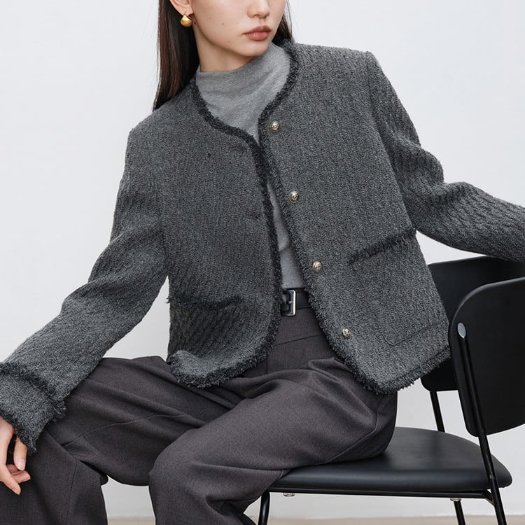 シンプルなノーカラーデザインに、上品なツイード調素材を合わせたジャケット。細部にあしらわれたフリンジと高級感のあるボタンが、洗練された女性らしさを際立たせます。シーンを選ばず使える万能アイテムとして、クローゼットにぜひ加えていただきたい一着です。