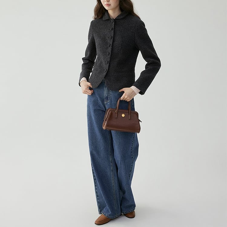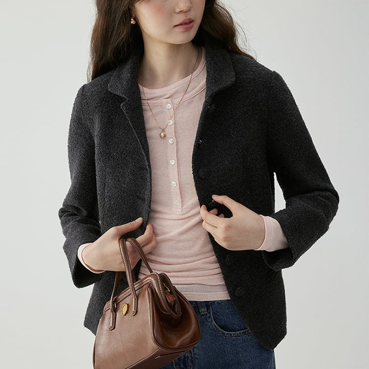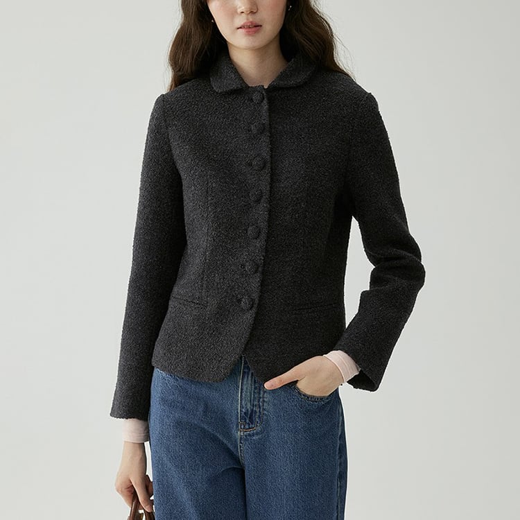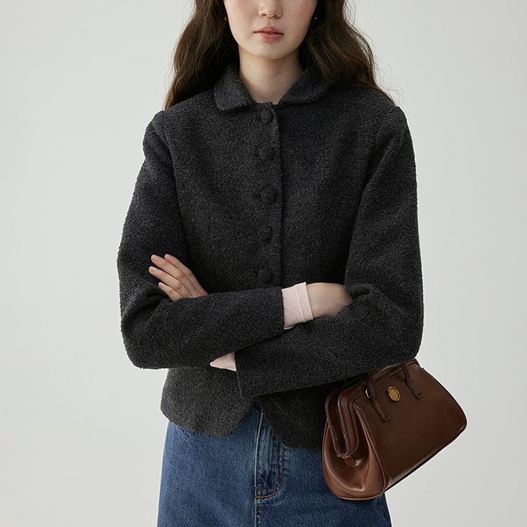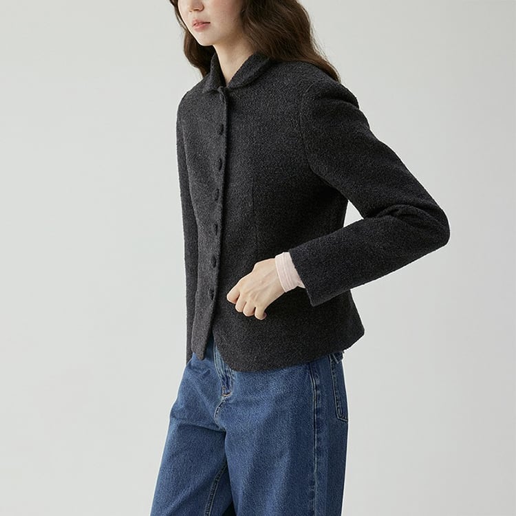 クラシカルな雰囲気を纏うショートジャケット。小ぶりな襟とくるみボタンが、さりげないおしゃれ感をプラス。深みのある色合いが、ワンランク上の着こなしを叶えてくれる、秋冬のワードローブに欠かせない一着です。