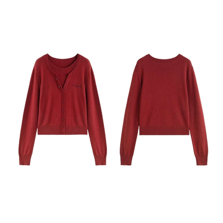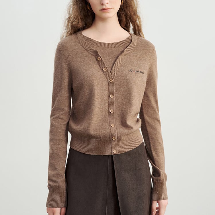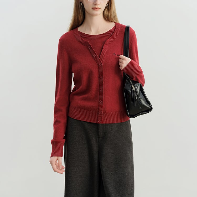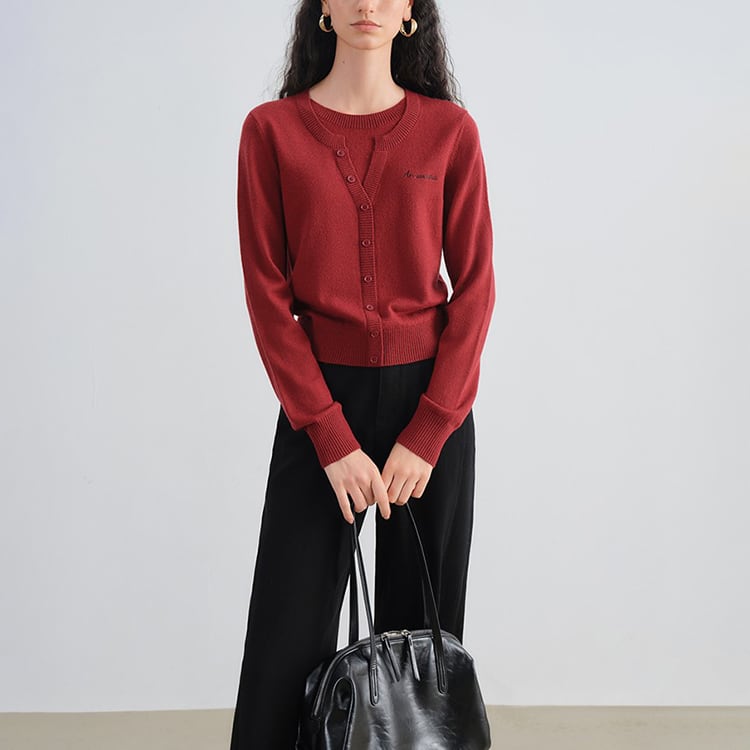 インナーとカーディガンを重ね着しているかのようなデザインのフェイクレイヤードニットです。深すぎず浅すぎない絶妙なVネックラインが、女性らしさを演出。これ一枚でアンサンブル風のスタイルが完成するので、忙しい朝もサッと着るだけで、きちんと感のあるおしゃれなルックが叶うアイテムです。