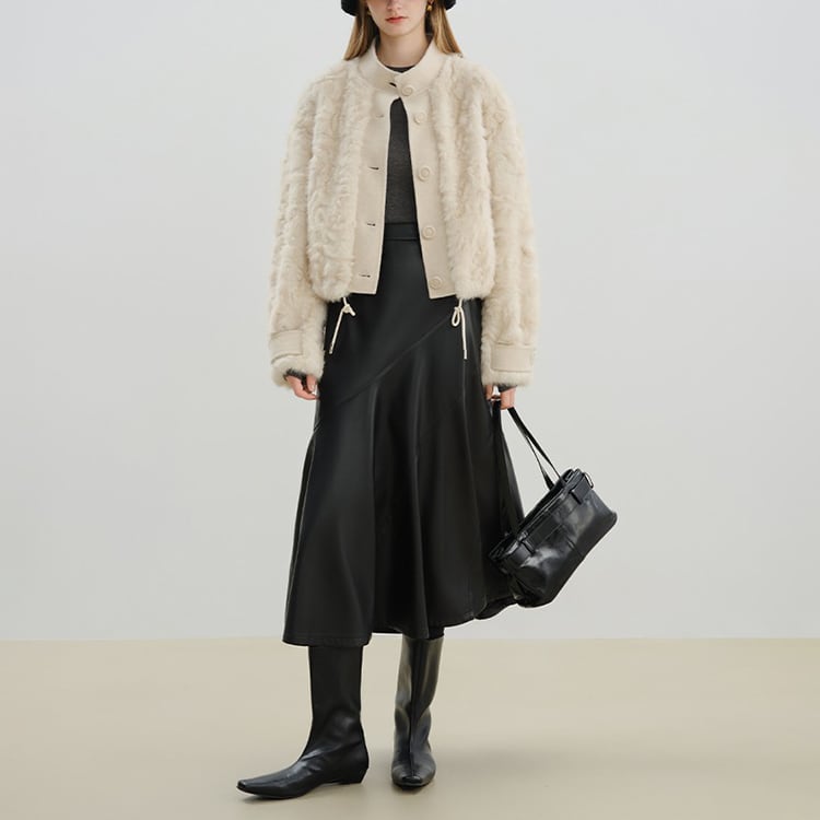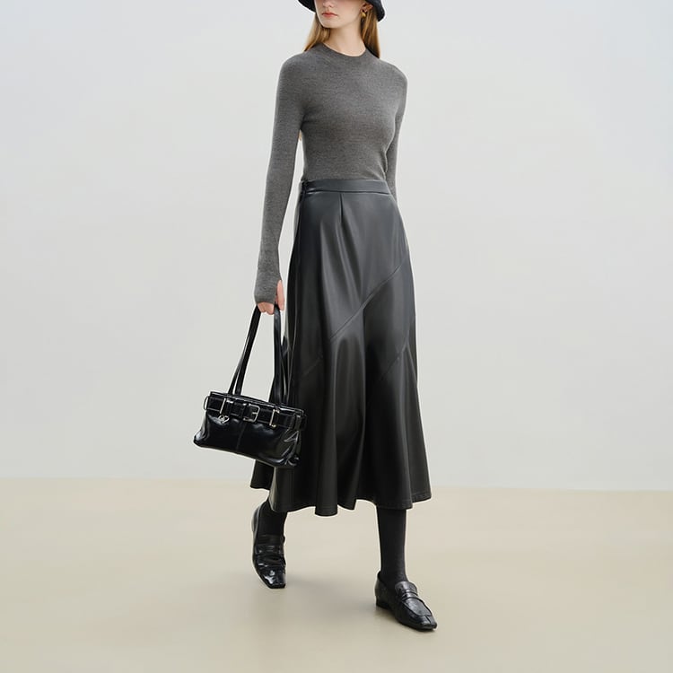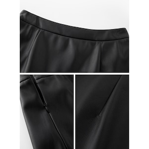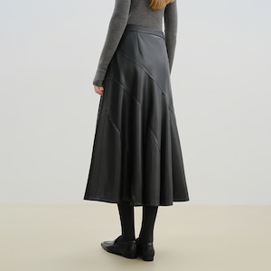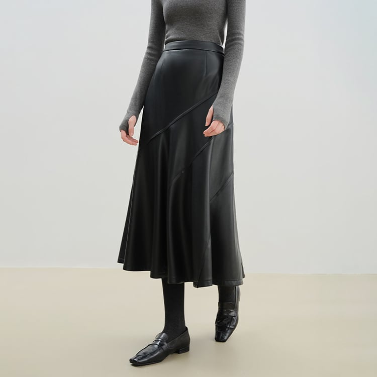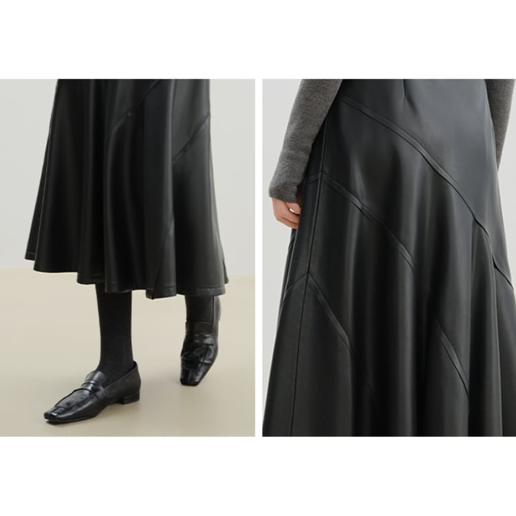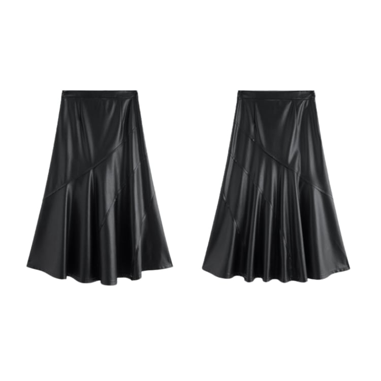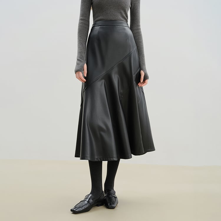 裾にかけて広がるフレアラインが美しいレザースカート。斜め切替がさりげないアクセントとなり、ドレープ感が一層女性らしさを引き立てます。フェイクレザーならではの軽やかさと、やわらかな裏地付きで履き心地も快適。デイリーユースから特別シーンまで幅広く活躍します
