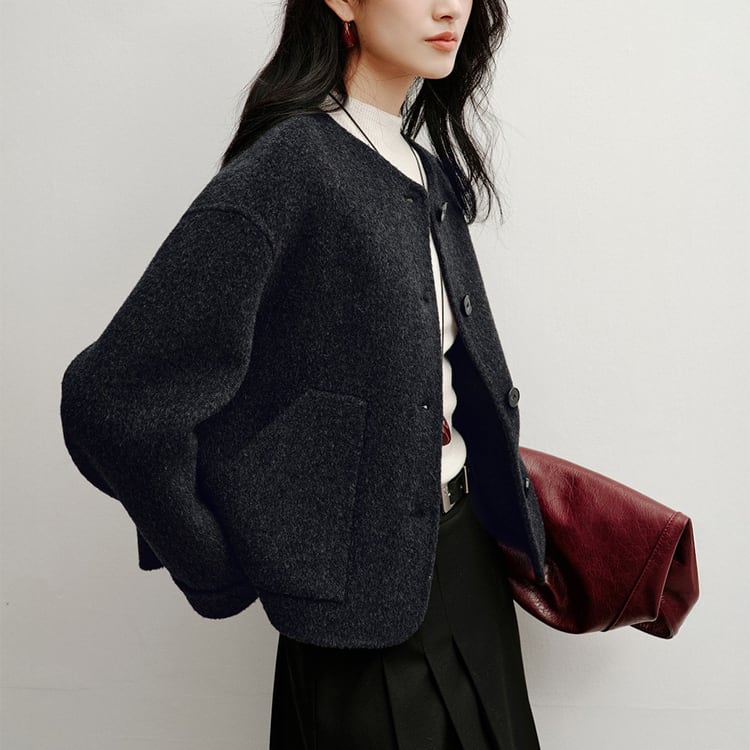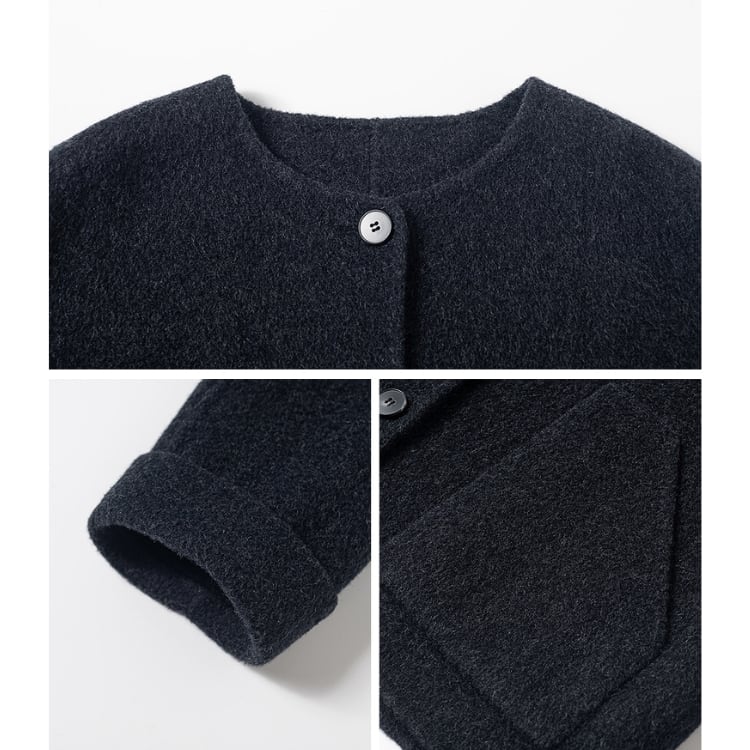 流行に左右されない、クラシックなノーカラーショートコート。シンプルで無駄のないデザインは、素材の上質さを際立たせます。程よい丈感で、どんなボトムスとも相性抜群、着回し力の高さも魅力的。いつものコーディネートがワンランクアップする、ワードローブに欠かせないアイテムです。