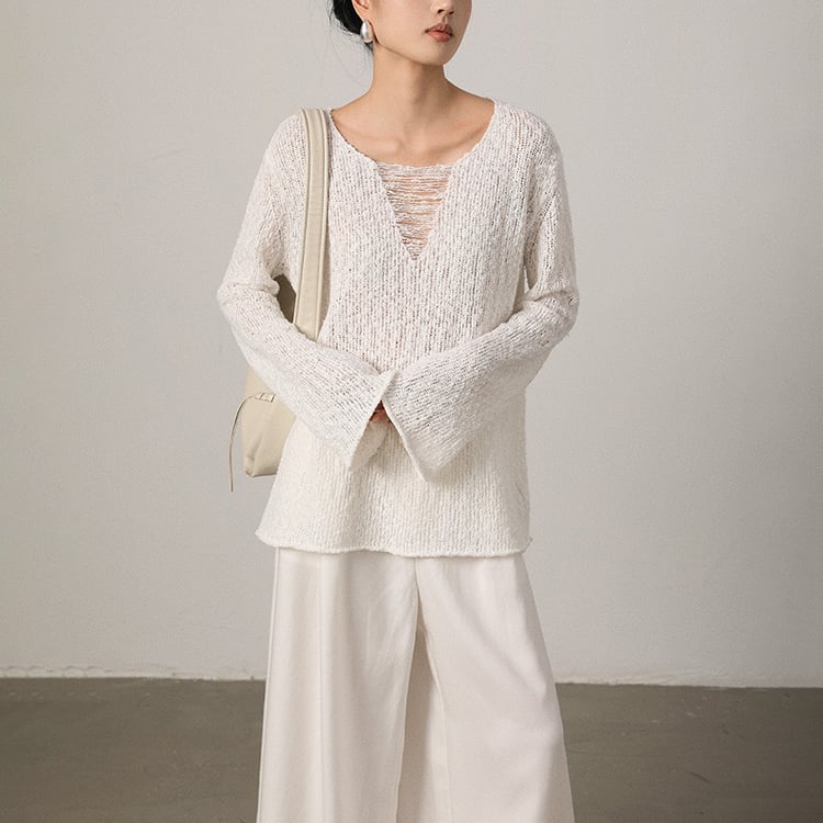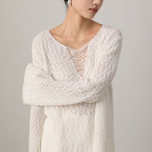 ナチュラルな質感と繊細な透け感が魅力のローゲージニット。深いVネックが首元をすっきりと見せ、レイヤードを楽しめます。ゆるやかなシルエットが大人の余裕を感じさせる一着です。