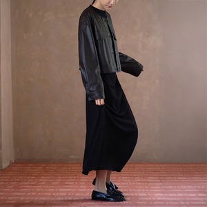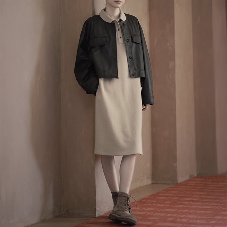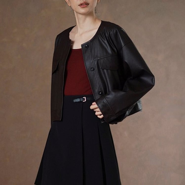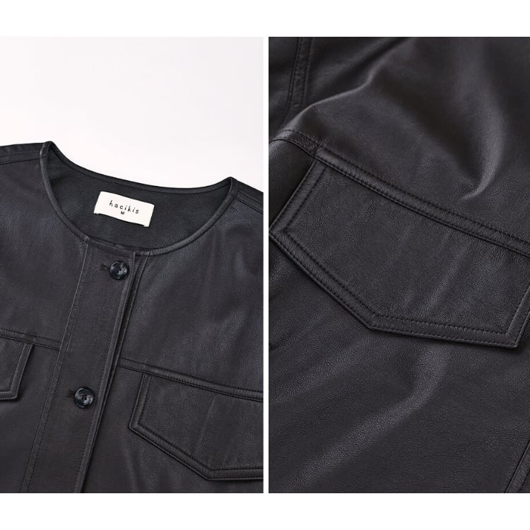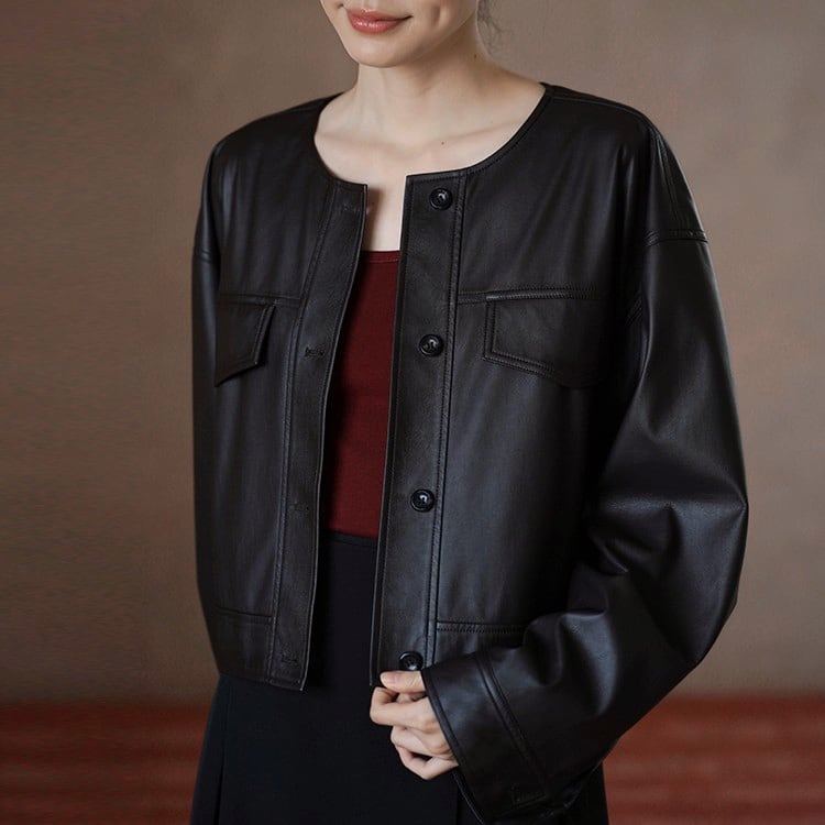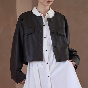 柔らかなフェイクレザーが上品に映える、ノーカラージャケット。クロップド丈が脚長効果、ドロップショルダーの抜け感あるシルエットで、モードにもカジュアルにも馴染みます。休日のお出かけやオフィスカジュアルにもぴったりなアイテムです。
