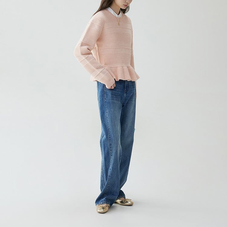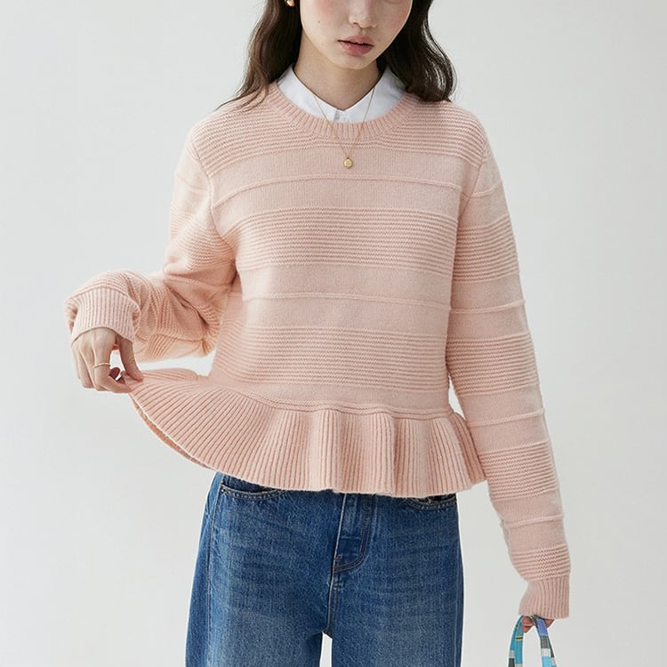 女性らしさを引き立てる可愛らしい、ペプラムデザインのニット。リブ編みが体のラインを拾いすぎず、裾のフリルの広がりが美しいシルエットを演出。パンツスタイルにもスカートにも合わせやすく、デイリー使いはもちろん、オフィスカジュアルにもおすすめの一枚です。