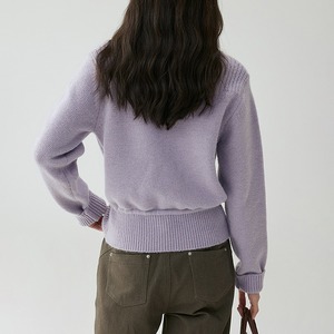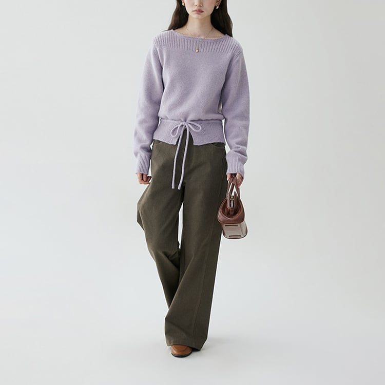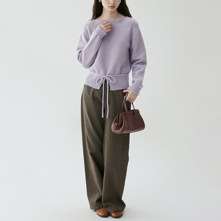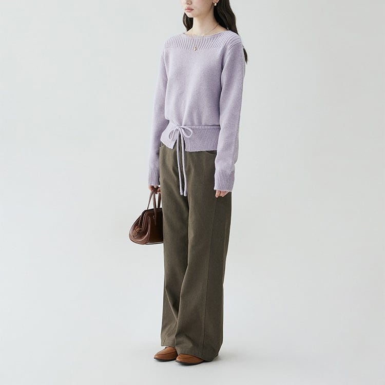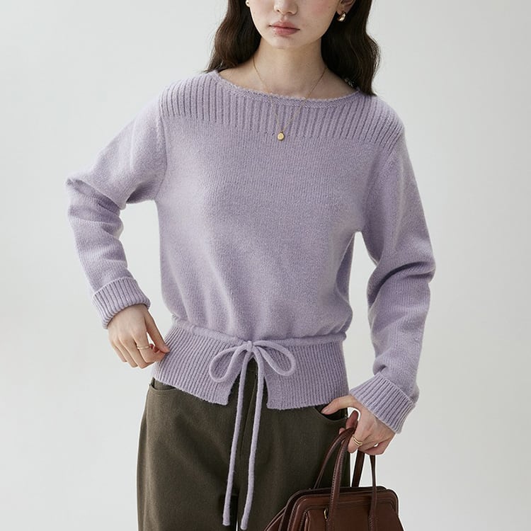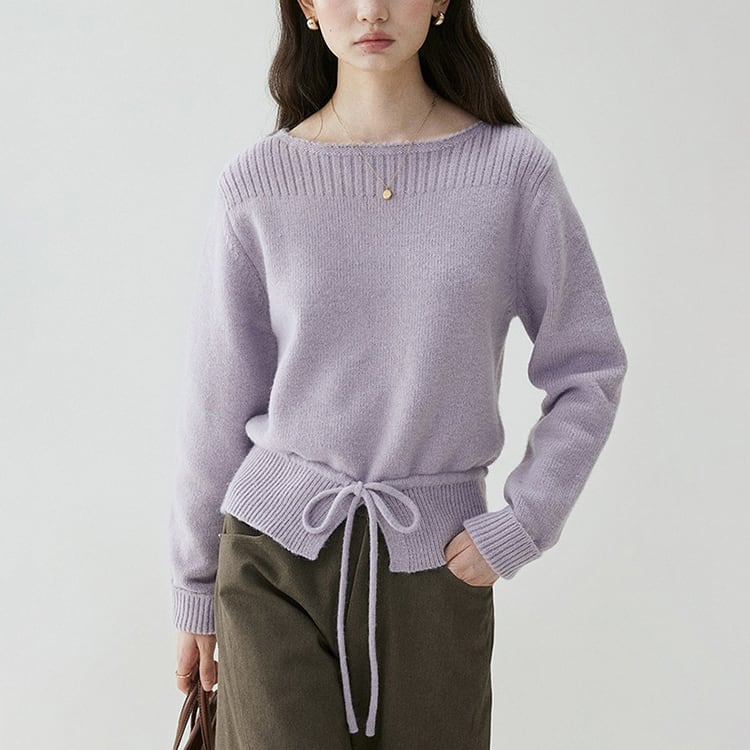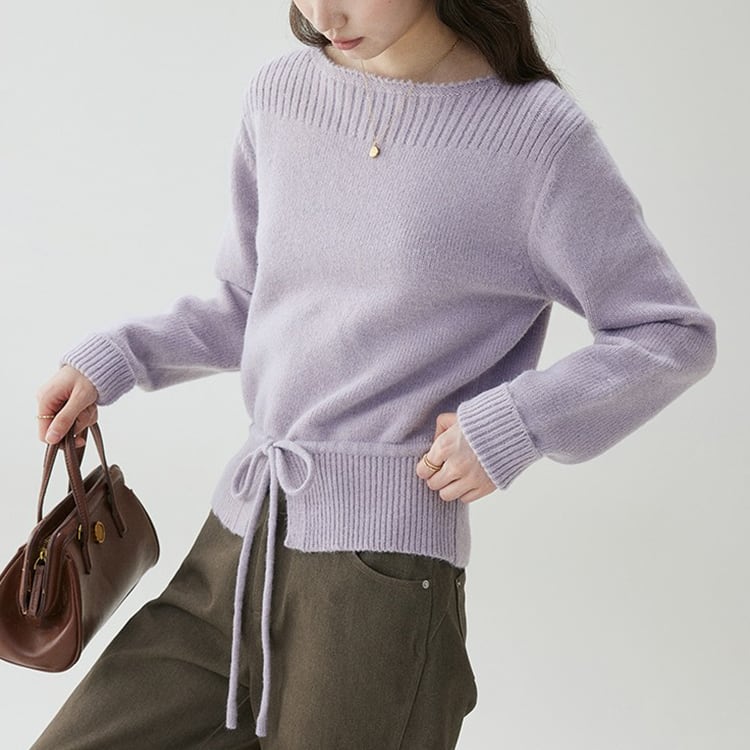 上部のリブ切り替えデザインが特徴的なニットプルオーバー。ボートネックで首元をすっきり見せ、ウエストのドローストリング、リボンが女性らしさをプラス。柔らかなラベンダーカラーが、冬のコーデを優しく彩る一枚です。