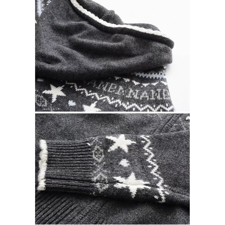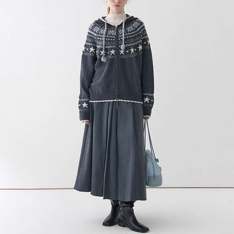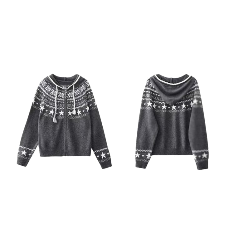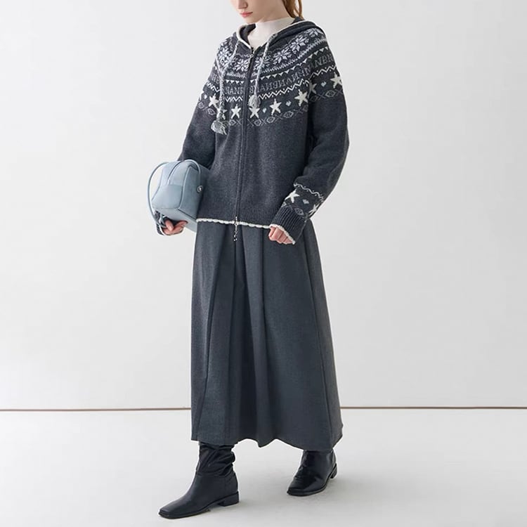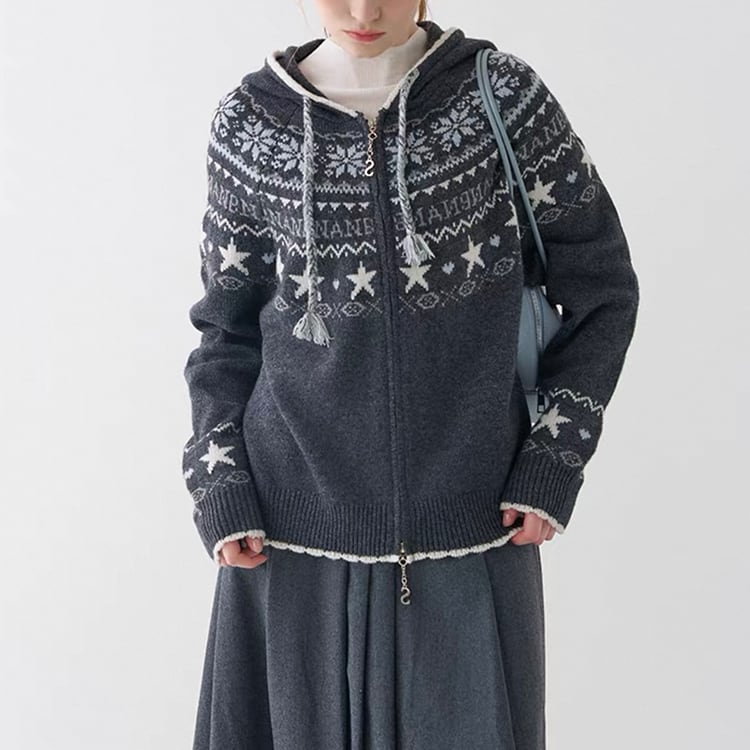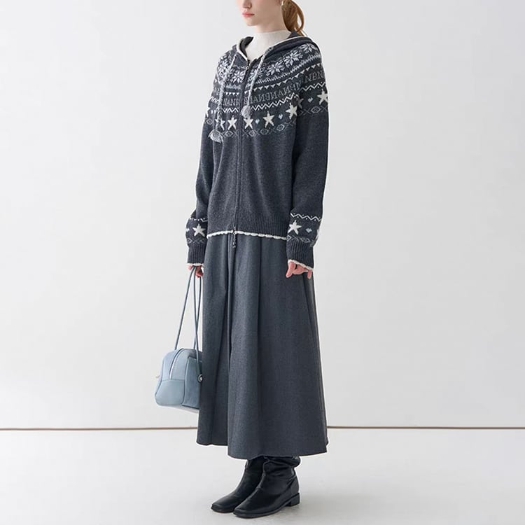 北欧テイストが魅力のノルディックパターンのニットカーディガン。フード付きで後ろ姿もかわいく、ダブルジップでスタイリングも自由自在。星と雪の模様がアクセントになり、冬のナチュラルコーデに映える一枚です。