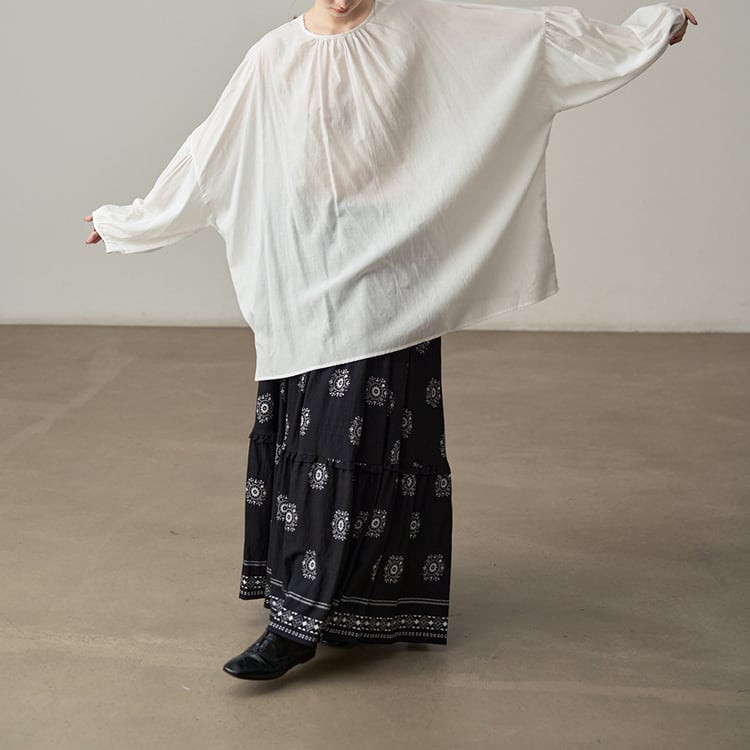 ブラックのベースにホワイトのエスニックプリントが特徴的なマキシスカート。フリルの付いたティアードデザインが立体感を生み、上品なフレアラインを描き、動くたびに優雅さを演出。ウエストはゴム仕様で、ストレスフリーな着用感を。モノトーン配色で甘くなりすぎず、シーズンレスに使える一枚です。