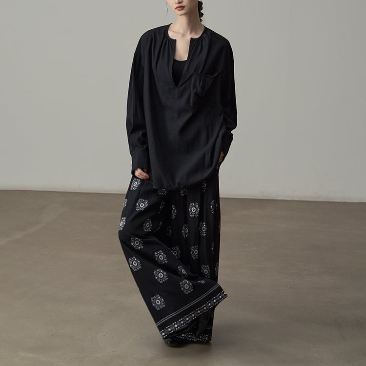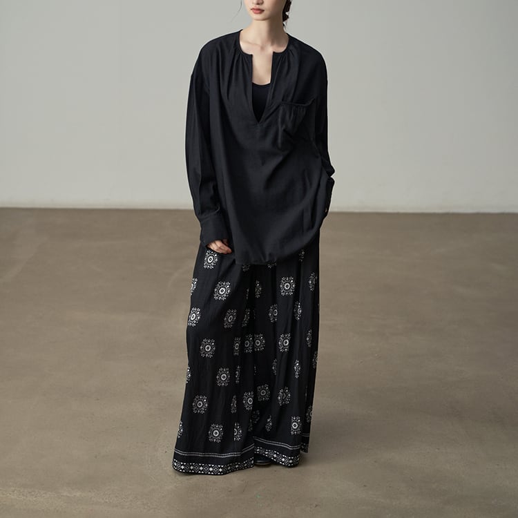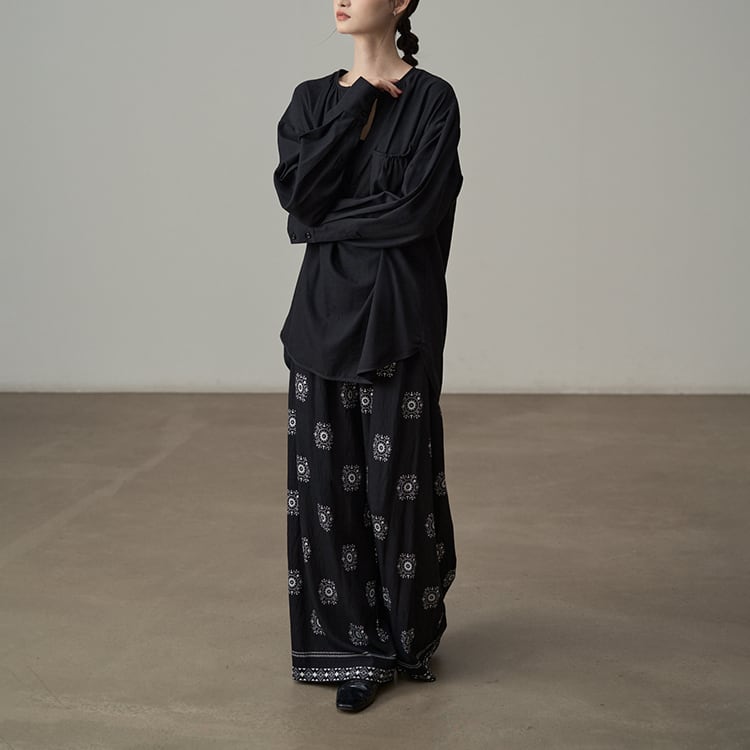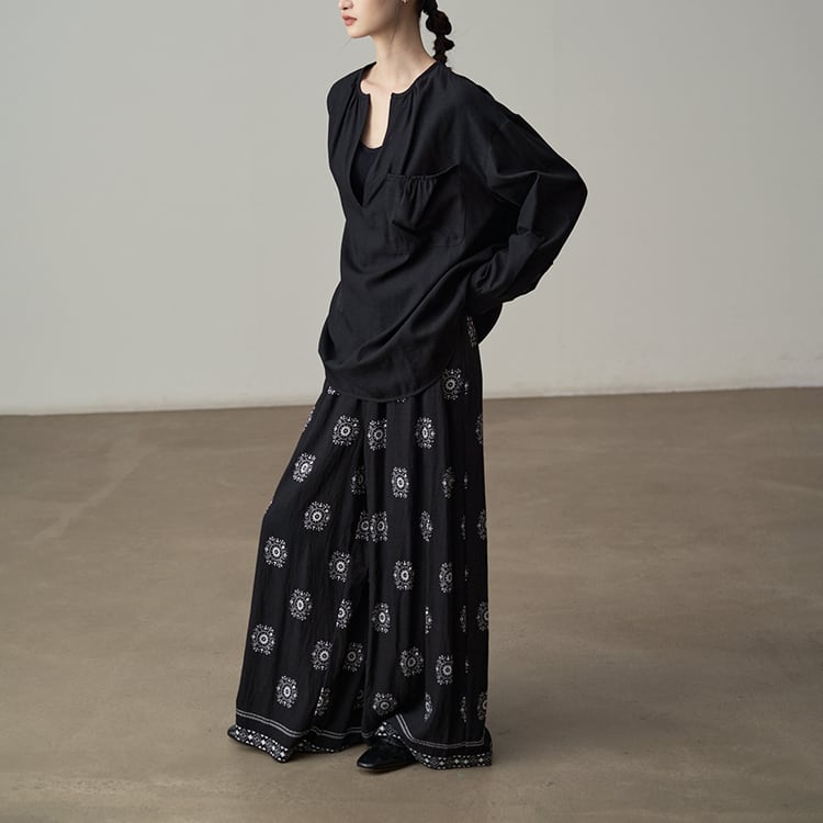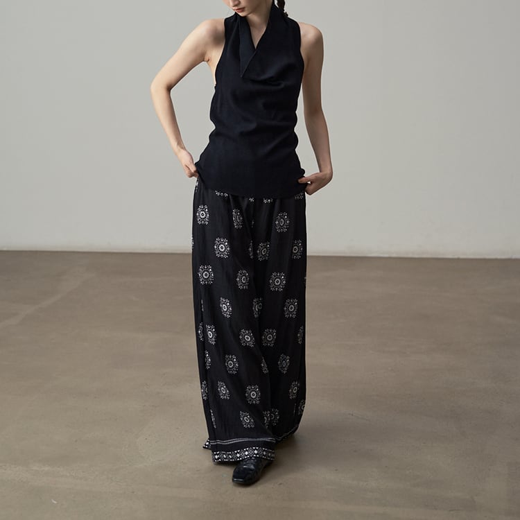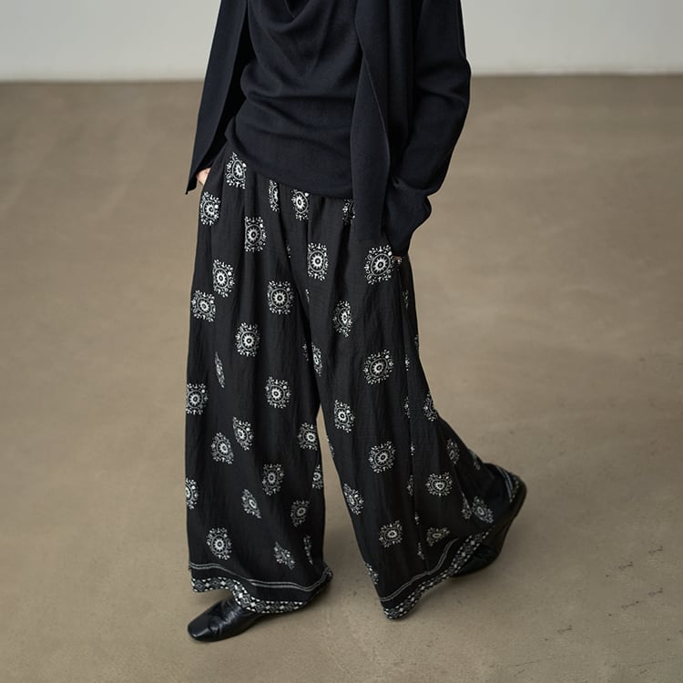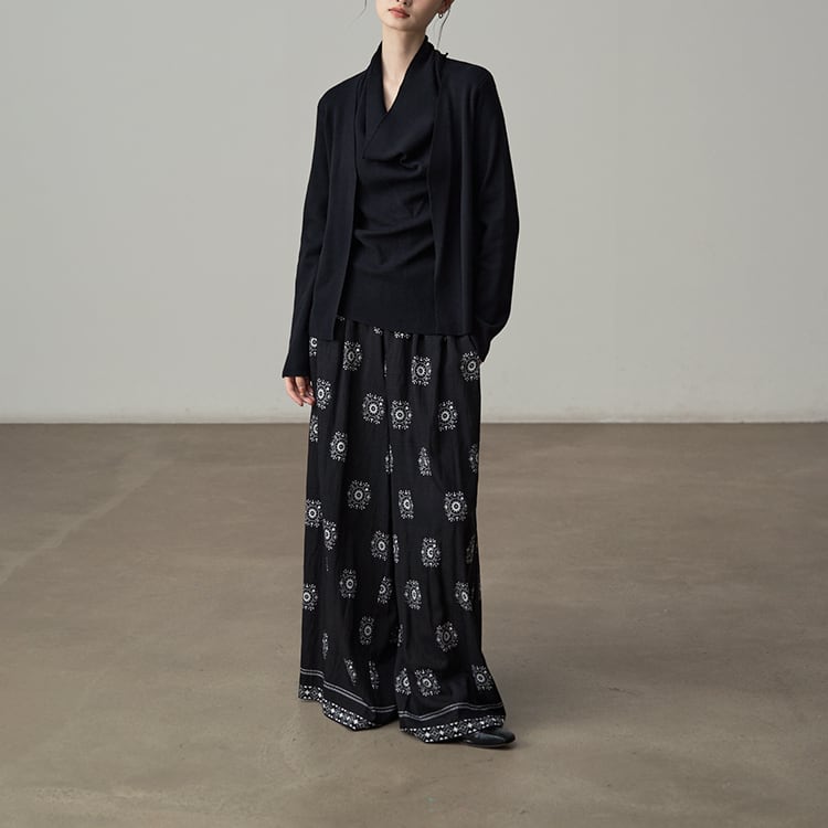 ブラックのベースにホワイトのエスニックプリントが印象的なワイドパンツ。ゆったりとしたシルエットとドレープ感のある生地が、歩くたびに美しく揺れ優雅さを演出。ウエストは総ゴム仕様で、履き心地も抜群。リゾートにもタウンユースにもぴったりな一枚です。