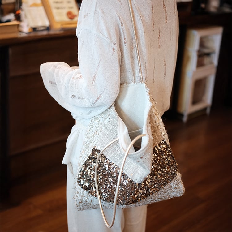 上品なツイード風生地に、華やかなスパンコールがアクセントが魅力のトートバッグ。普段使いに取り入れるだけでコーデが華やかになり、サブバッグとしてもおすすめのバッグです。