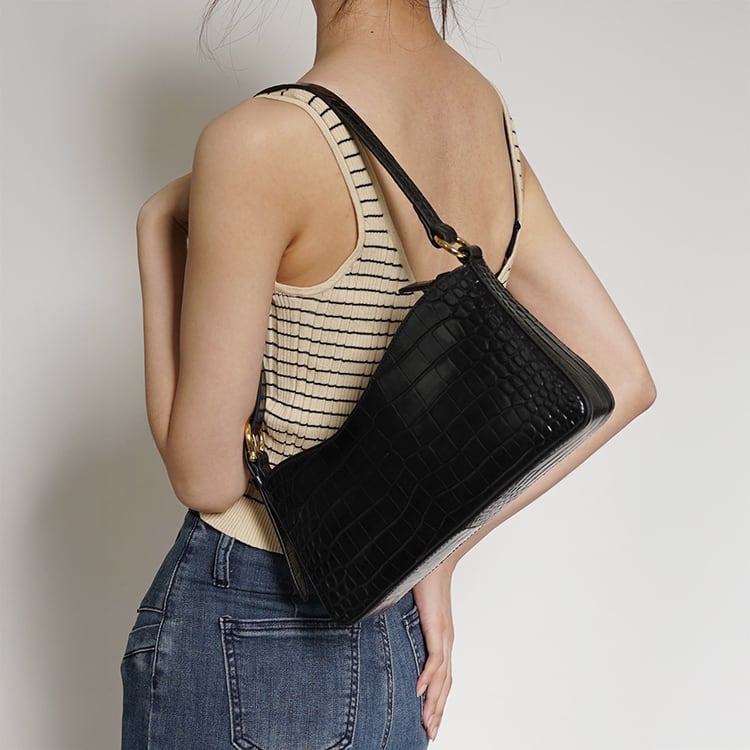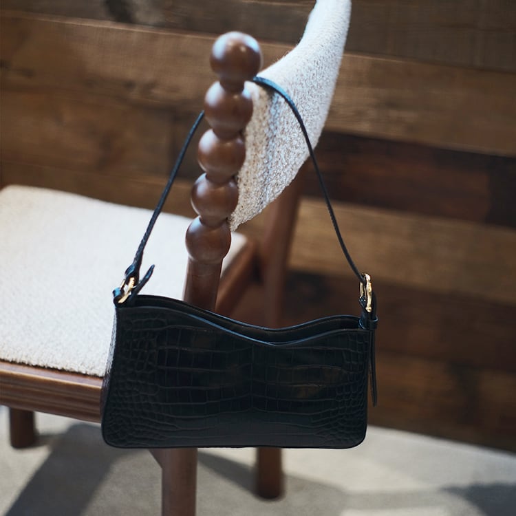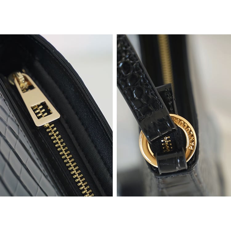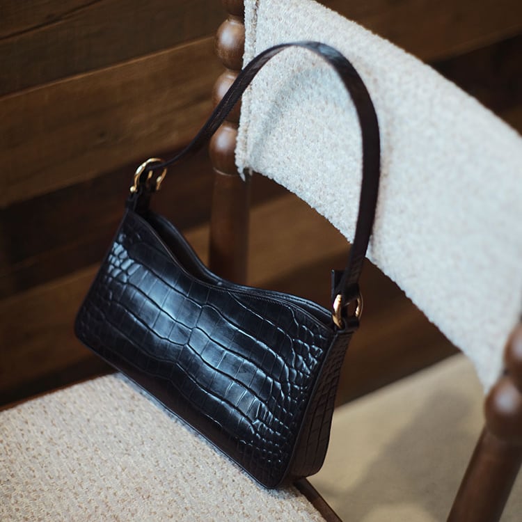 艶やかな牛革にクロコダイルの型押しを施し、エレガントでモードな印象のショルダー。ゴールドの金具が上品なアクセントとなり、シンプルコーデに合わせるだけで、ラグジュアリーな雰囲気をプラス。ハンドバッグ、ショルダーの2way仕様で、カジュアルからフォーマルまで幅広く使える万能アイテムです。