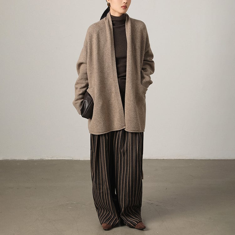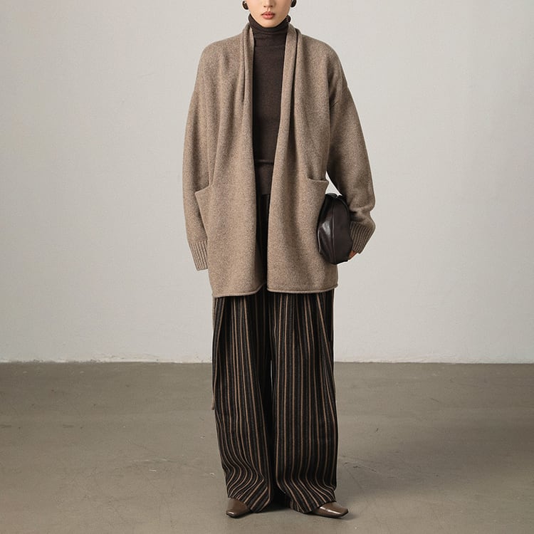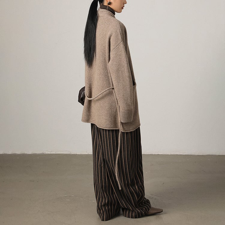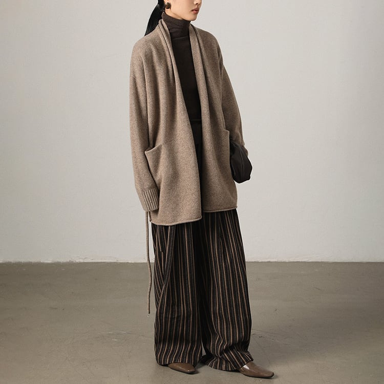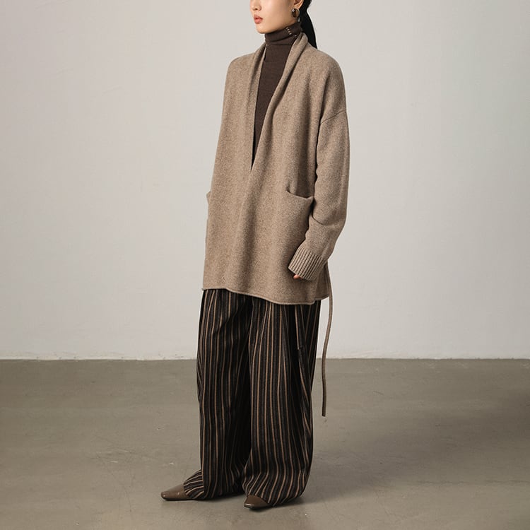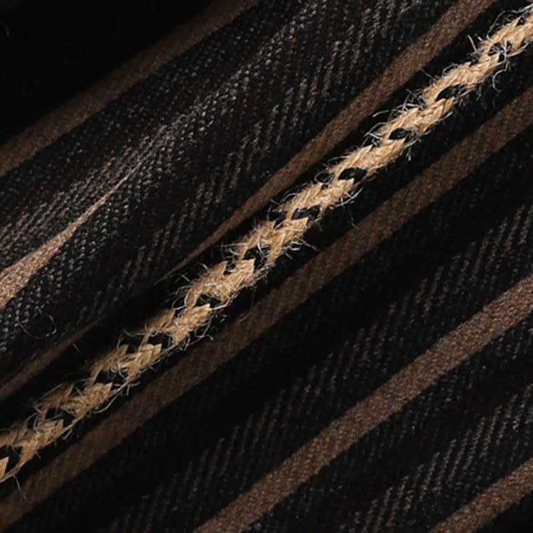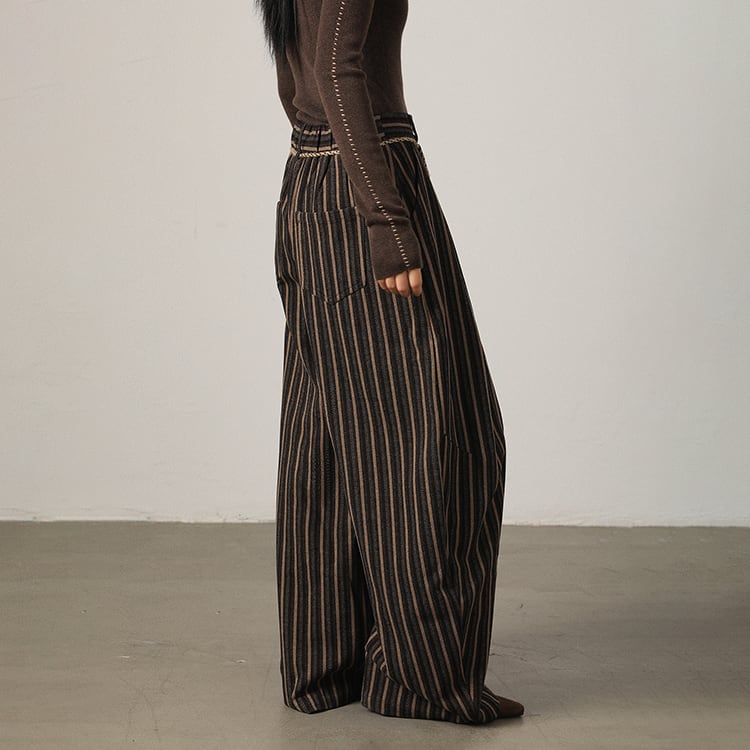 ヴィンテージ感漂うストライプ柄に、ウエストにはビーズ付きリネン風紐がアクセントになったワイドパンツ。ゆったりとしたシルエットに、落ち感のある素材で脚長効果も抜群。トップス次第でカジュアルにもモードにも変化。大人の個性を引き出す一本です。