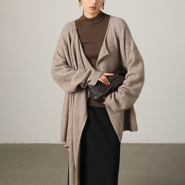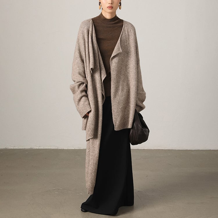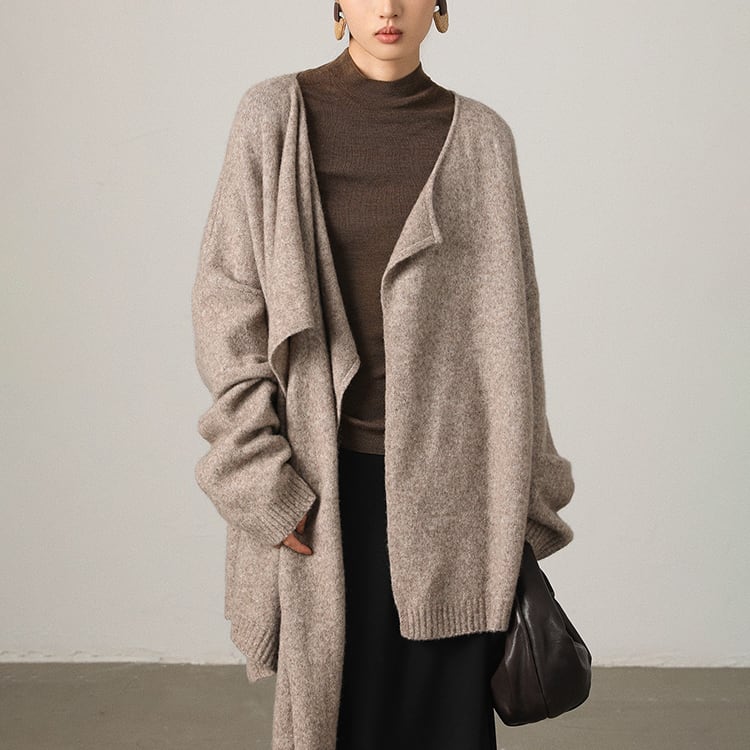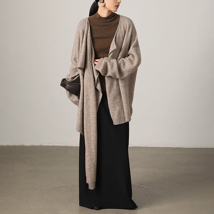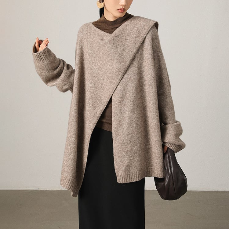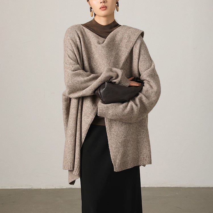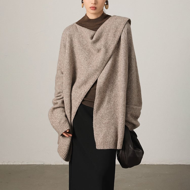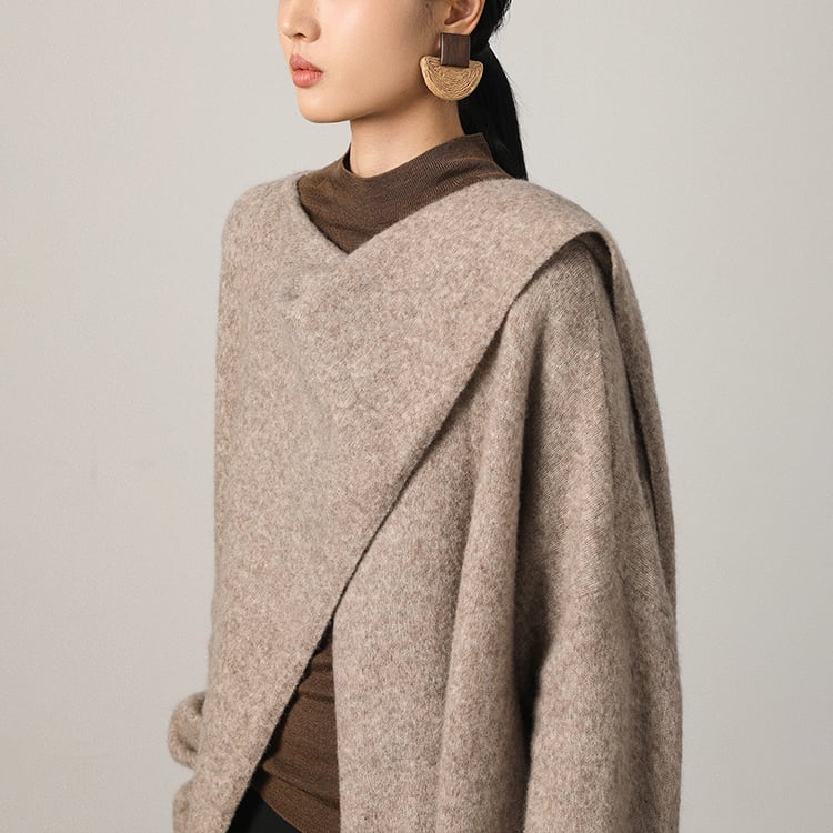 首元に自然なドレープを生み出すスカーフ風ニット。ゆったりとしたシルエットとアシンメトリーなデザインが個性を引き立て、洗練された印象に。大判ストールを羽織ったような、大人の余裕を感じさせる一着です。