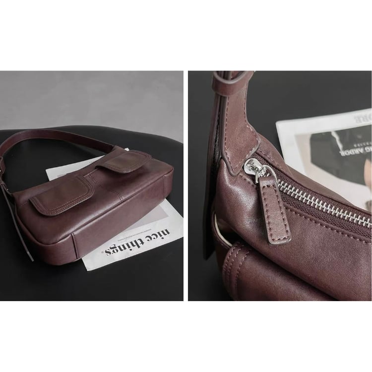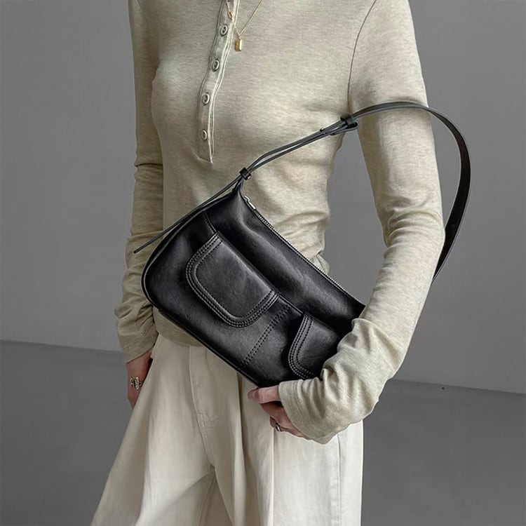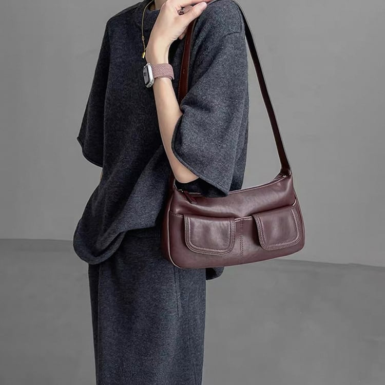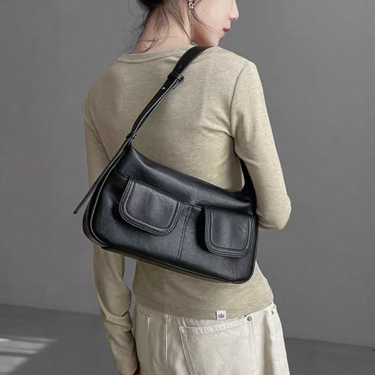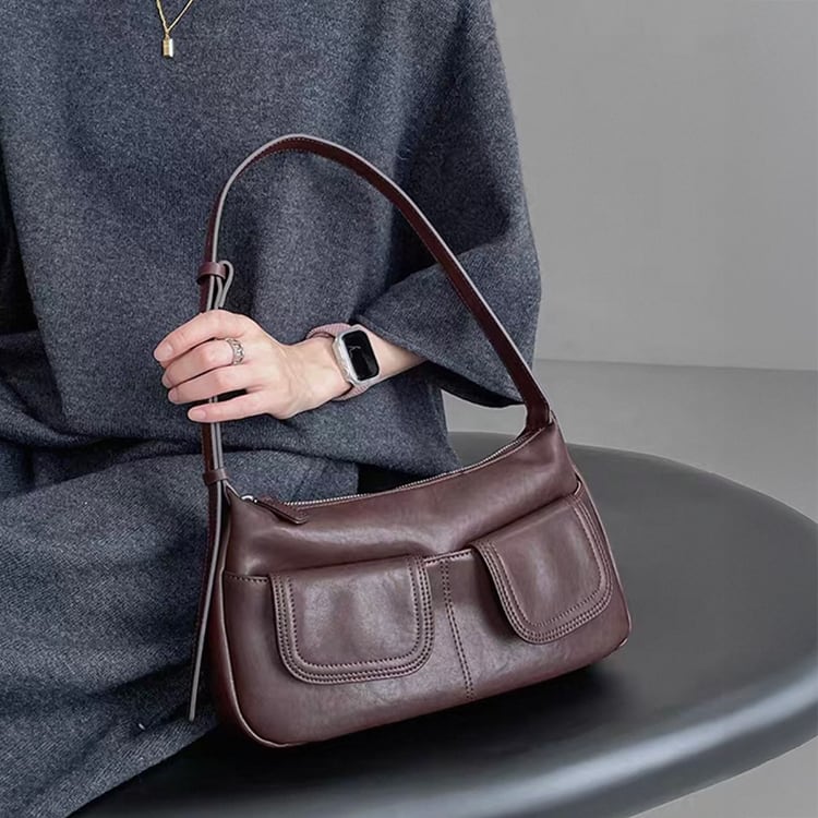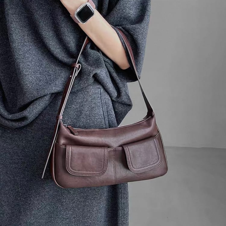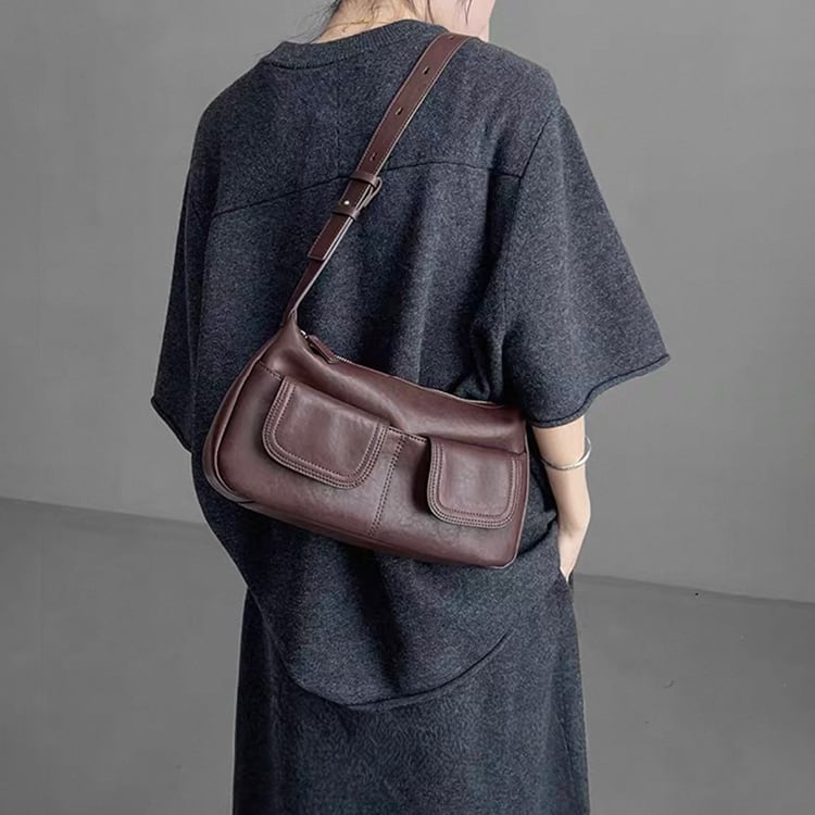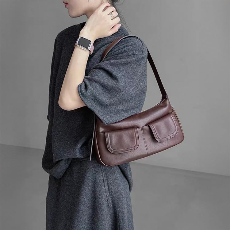 ヴィンテージライクなデザインが魅力のレザーバッグ。フロントに施されたWポケットが程よいカジュアルさとデザイン性をプラス。ハンドバッグとしてもショルダーバッグとしても使える2way仕様で、カジュアルスタイルから、きれいめな通勤コーデまで幅広く活躍し、ブラウンとブラックのベーシックなカラーバリエーションで、どんな装いにも馴染む一品です。