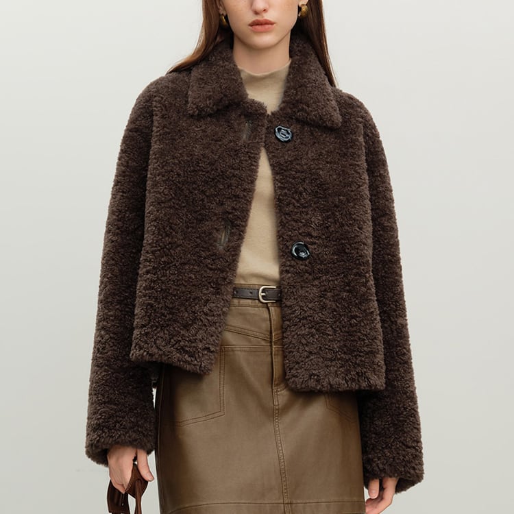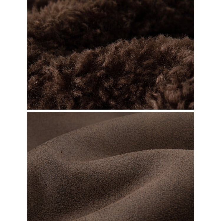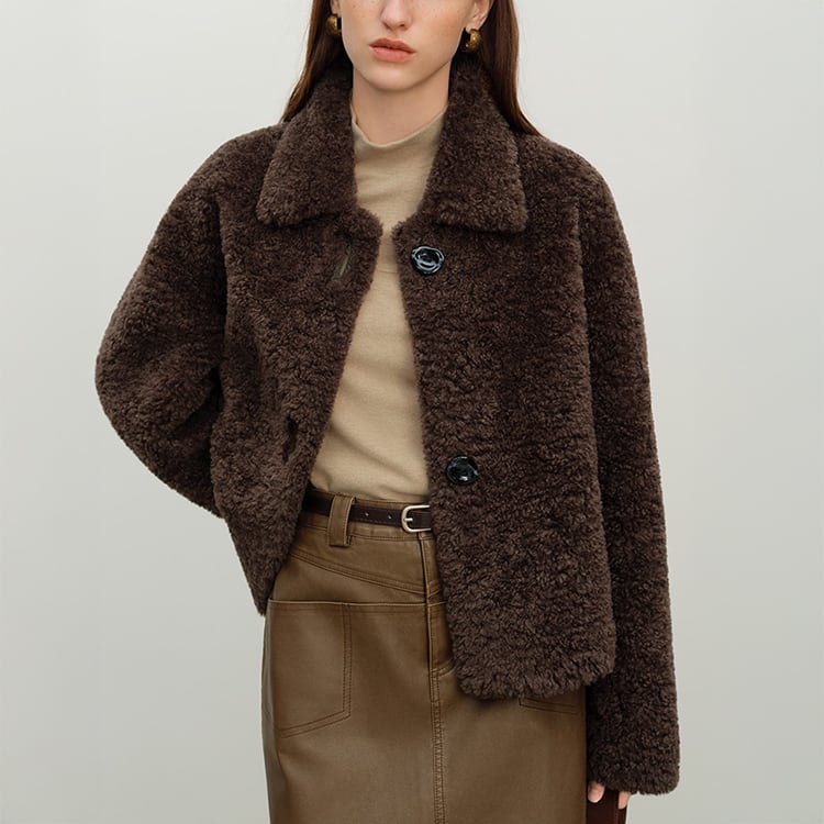 冬のコーデに温かみを添えるフェイクシープショートジャケット。巻き毛のようなふわふわ素材が暖かさと可愛らしさを両立し、見た目以上に軽い着心地。フェイクレザーポケットがシンプルなデザインのアクセントとなり、モカブラウンの深い色味が大人の冬スタイルを格上げします。