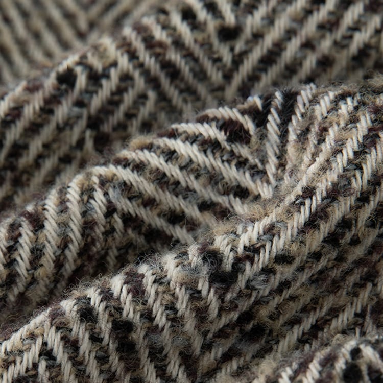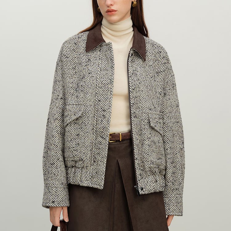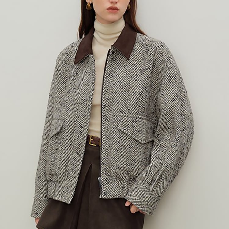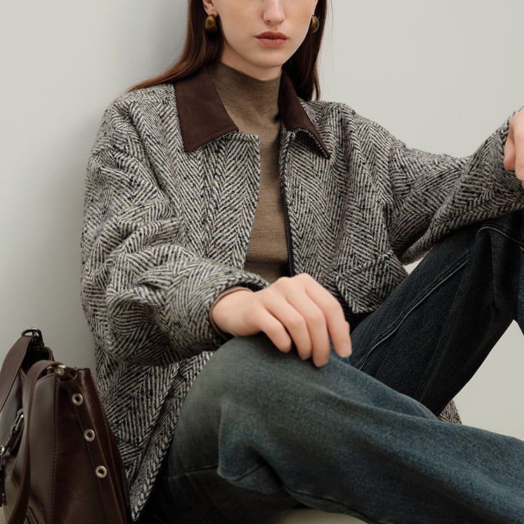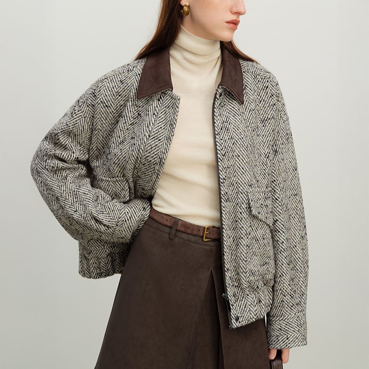 クラシックなヘリンボーン柄生地に、スエード調の小さめ襟を組み合わせたレトロバーン風ジャケット。ドロップショルダーのゆるシルエットで抜け感を演出し、裾のしっかりしたリブでメリハリをプラス。異素材のコントラストが上品で、大人カジュアルにもキレイめにも合わせやすい一着です。