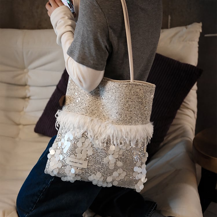 下部は大粒スパンコールと白いフェザーのトリムで立体感を出したデザインのショルダートート。上部はナチュラルトーンのツイード調が魅力。シンプルスタイルのアクセントに最適。普段のコーデに“特別感”をプラスしてくれるアイテムです。