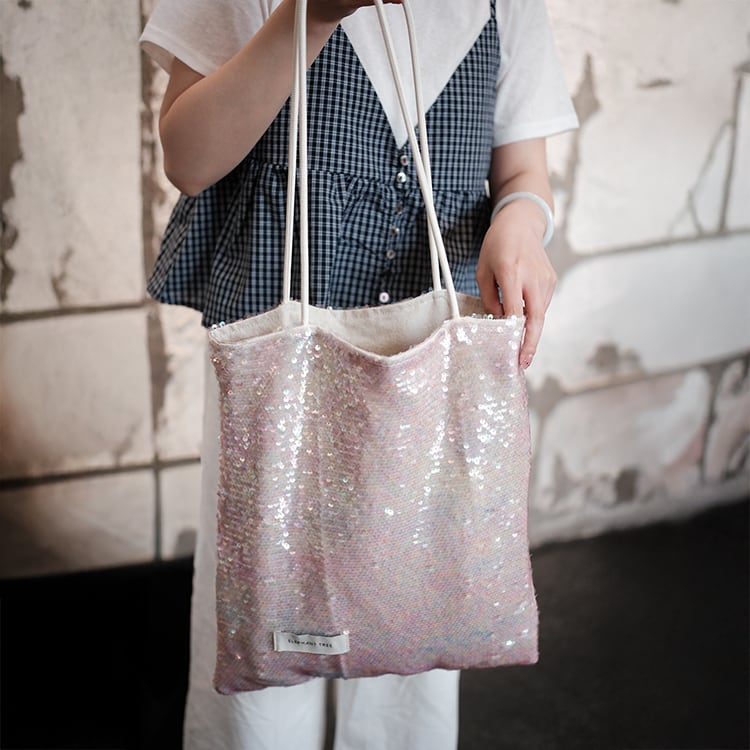 華やかなオーロラピンクのスパンコールが光を受けて美しく輝く、存在感たっぷりのショルダートートバッグ。女性らしい柔らかさと遊び心のあるデザインで、持つだけで華やかな印象に。可愛いのにしっかり入る、使い勝手の良さが魅力です。
