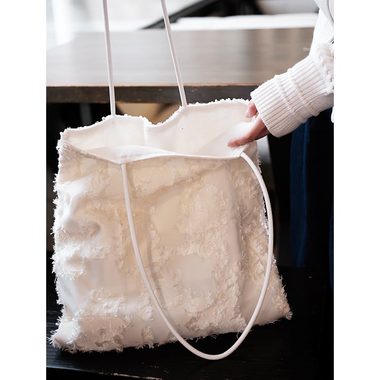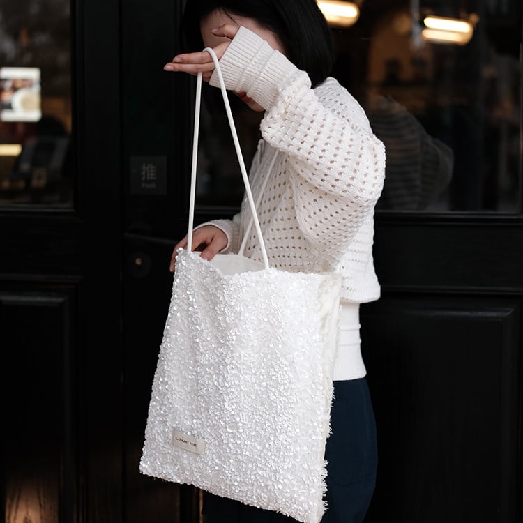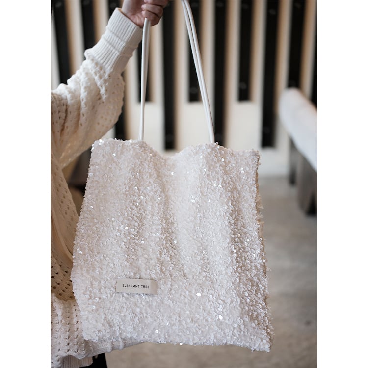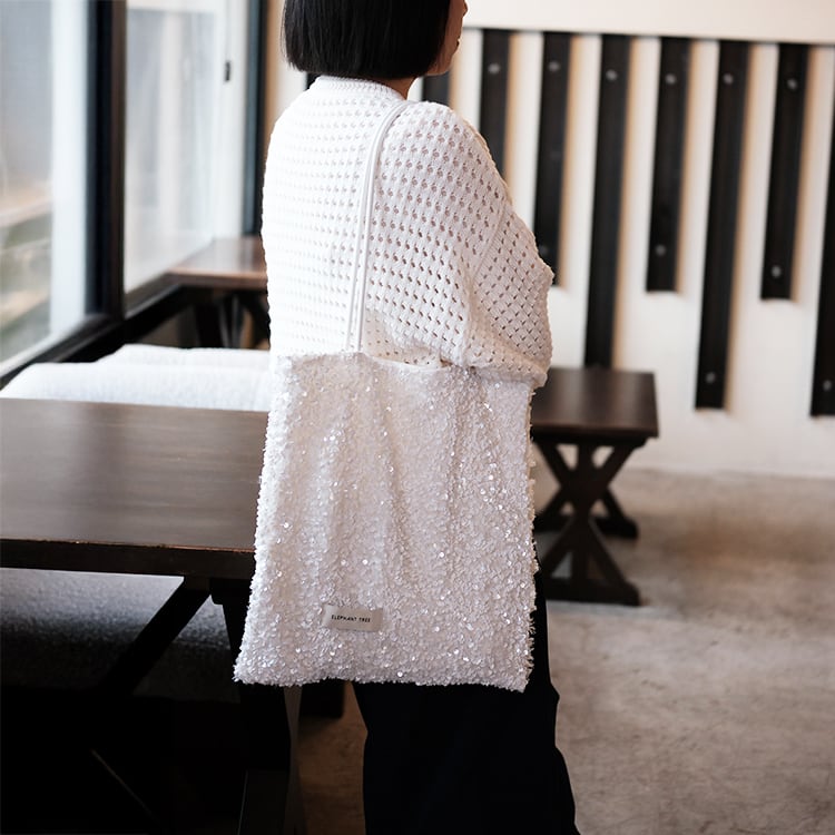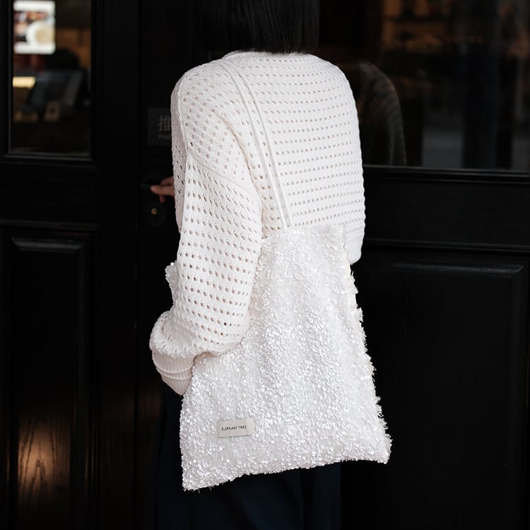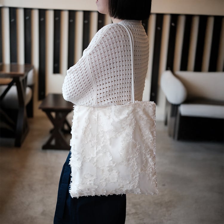 表面はホワイトスパンコールのシャイニー感に、裏面がフリンジの優しいテクスチャーを組み合わせたデザインバッグ。1つで2つの表情を楽しめる、シーンやコーデに合わせて使い分けできる使い勝手の良いショルダートートです。
