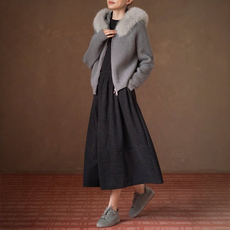 贅沢にあしらったボリュームたっぷりなフォックスファーが特徴的なニットカーディガン。立体的なリブ編みと、ダブルジッパー仕様でインナーを見せるレイヤードスタイルも楽しめ、ラグランスリーブがこなれ感を演出。ファーはシーンや気分に合わせて取り外し可能で、冬のおしゃれを格上げしてくれる一着です。