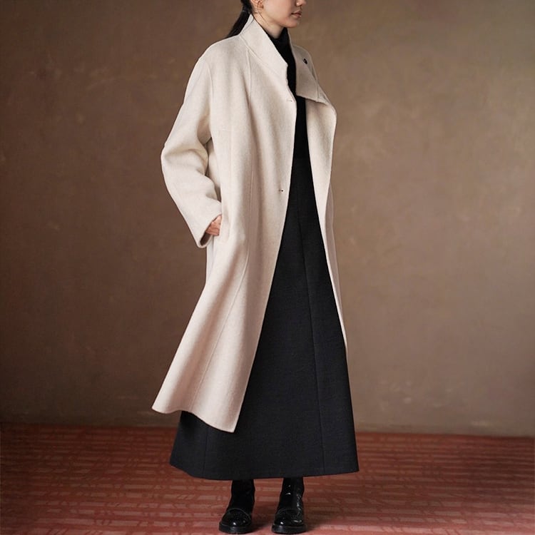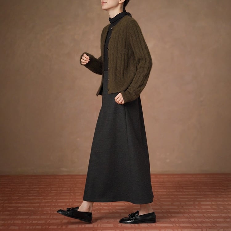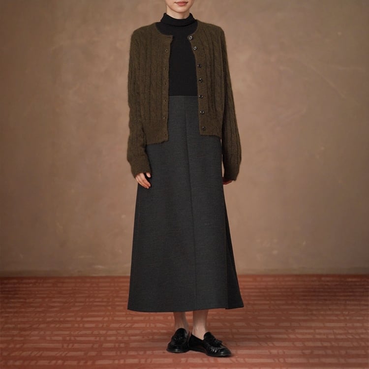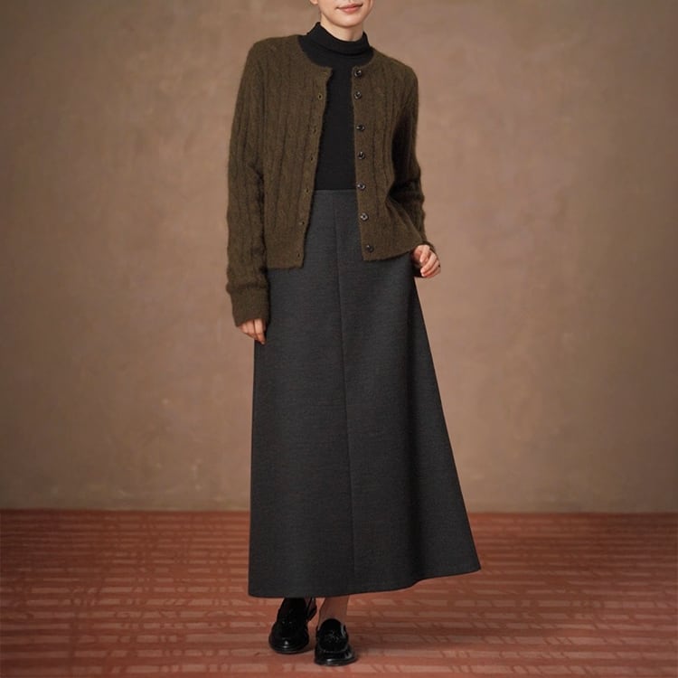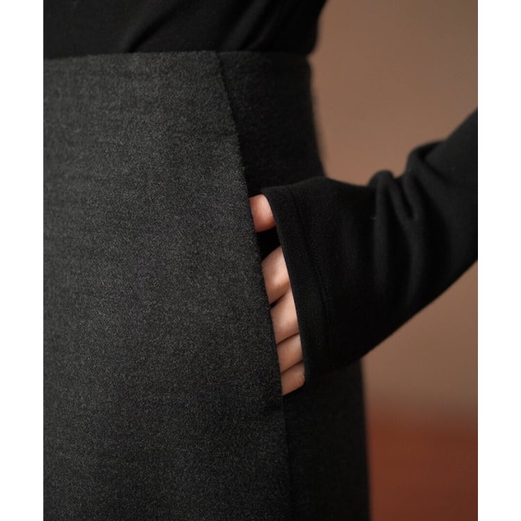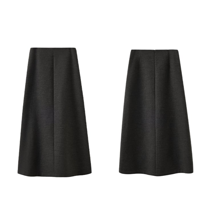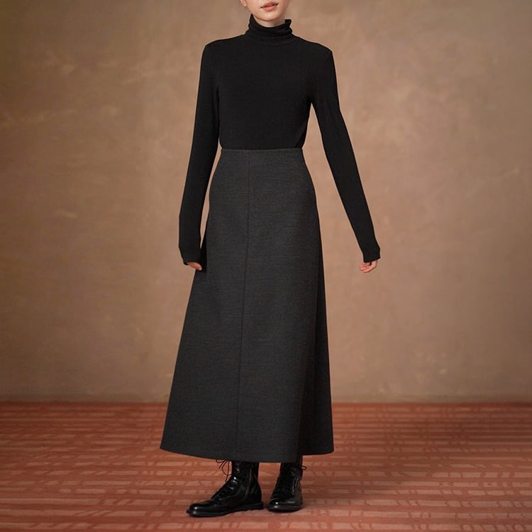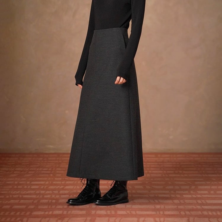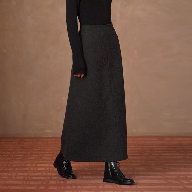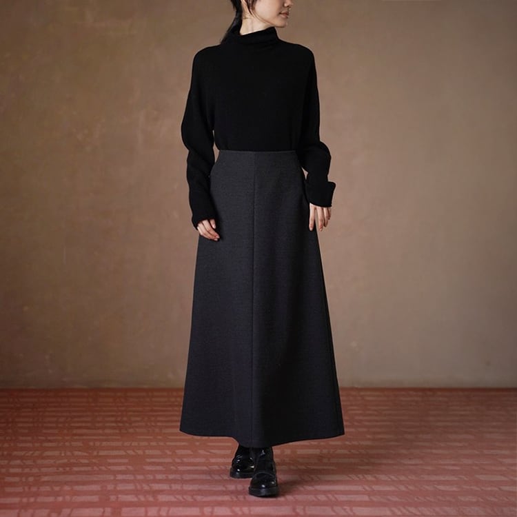ウール調生地ときれいなAラインが魅力のロングスカート。ハイウエストでウエストをしっかりと引き締め、腰位置を高く見せることで自然な脚長効果を実現。どんなトップスとも合わせやすいミニマルデザインで、秋冬のデイリーコーデを上品に格上げします。
