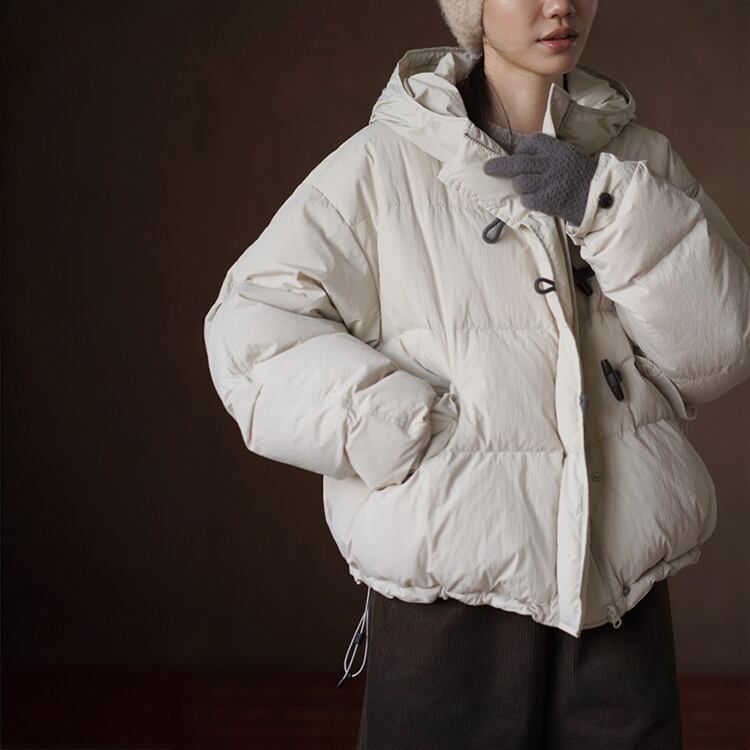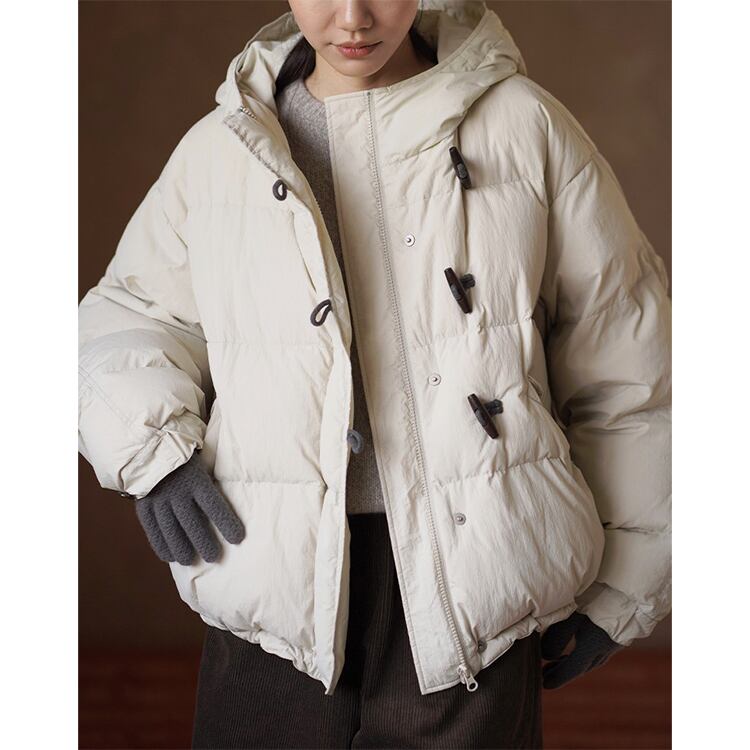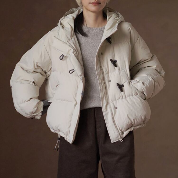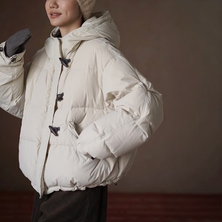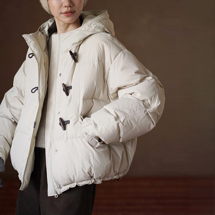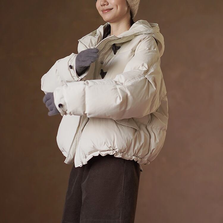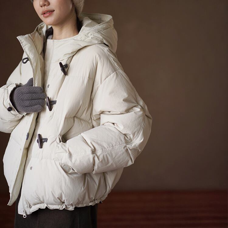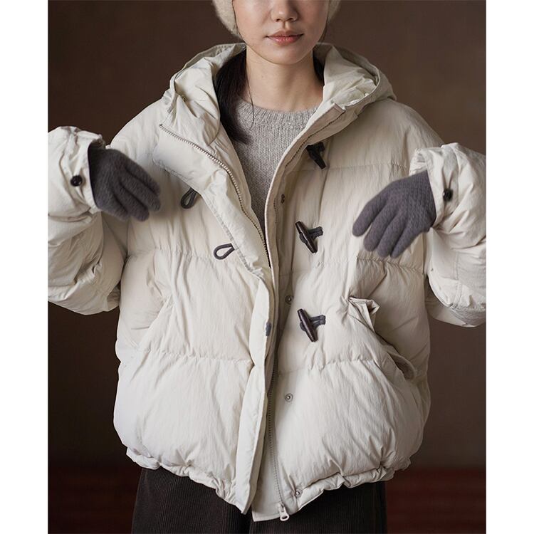 オフホワイトの柔らかなニュアンスが冬のコーデに上品さをプラスするショートダウンジャケット。ホワイトダックダウンを贅沢に使用した、軽量で確かな保温力が魅力です。トグルボタンのクラシックなアクセントが大人可愛さを引き立て、冬のタウンユースや通勤にも最適な万能アウターです。