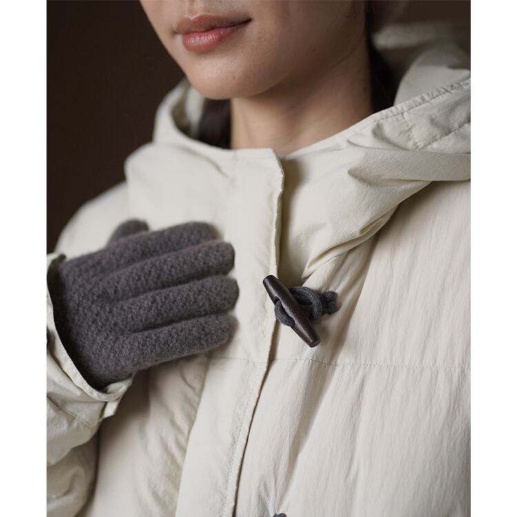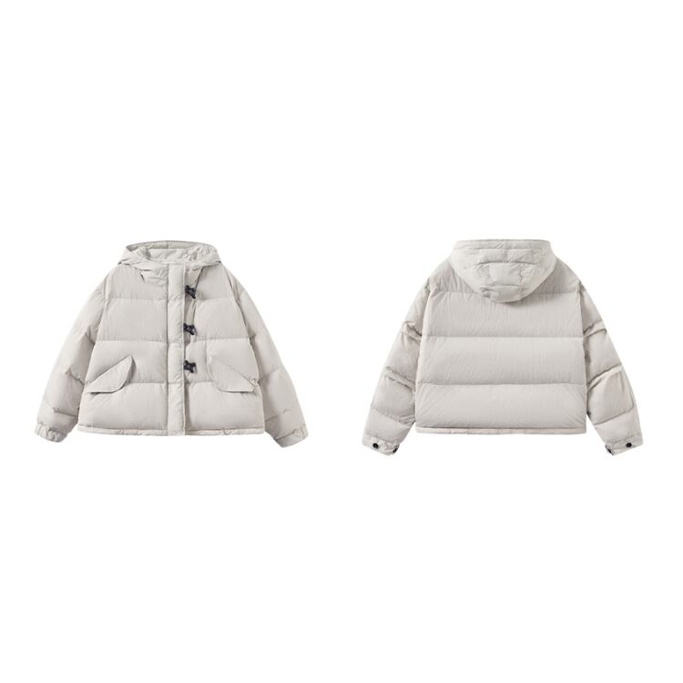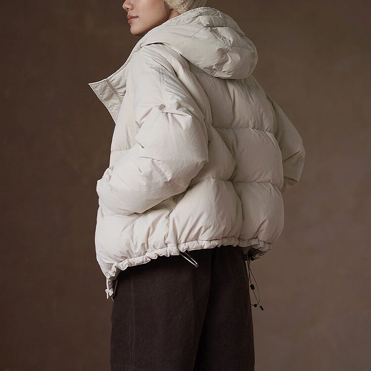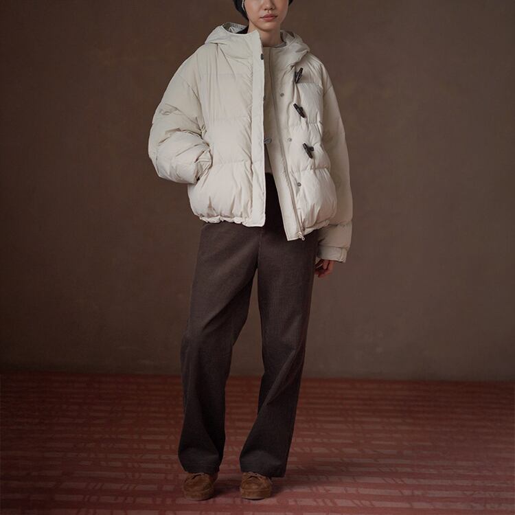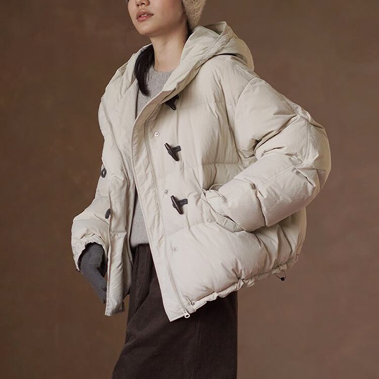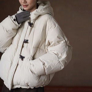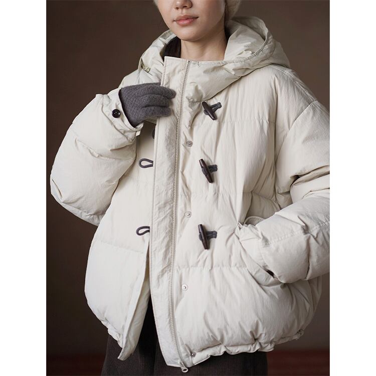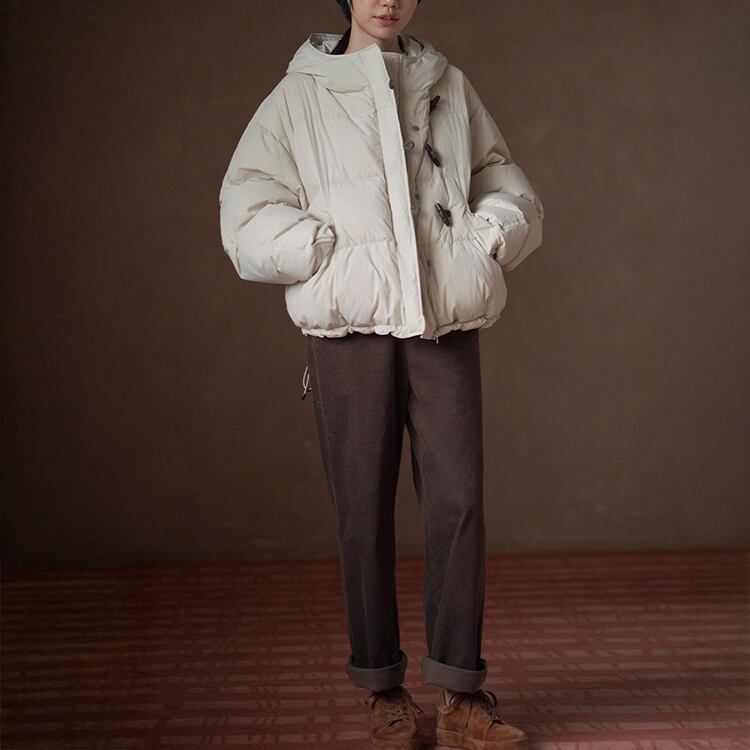オフホワイトの柔らかなニュアンスが冬のコーデに上品さをプラスするショートダウンジャケット。ホワイトダックダウンを贅沢に使用した、軽量で確かな保温力が魅力です。トグルボタンのクラシックなアクセントが大人可愛さを引き立て、冬のタウンユースや通勤にも最適な万能アウターです。