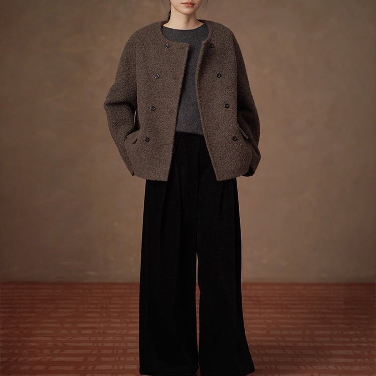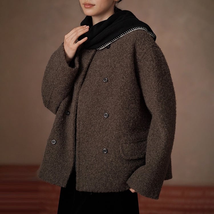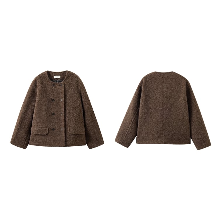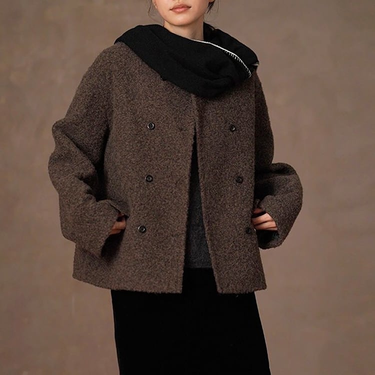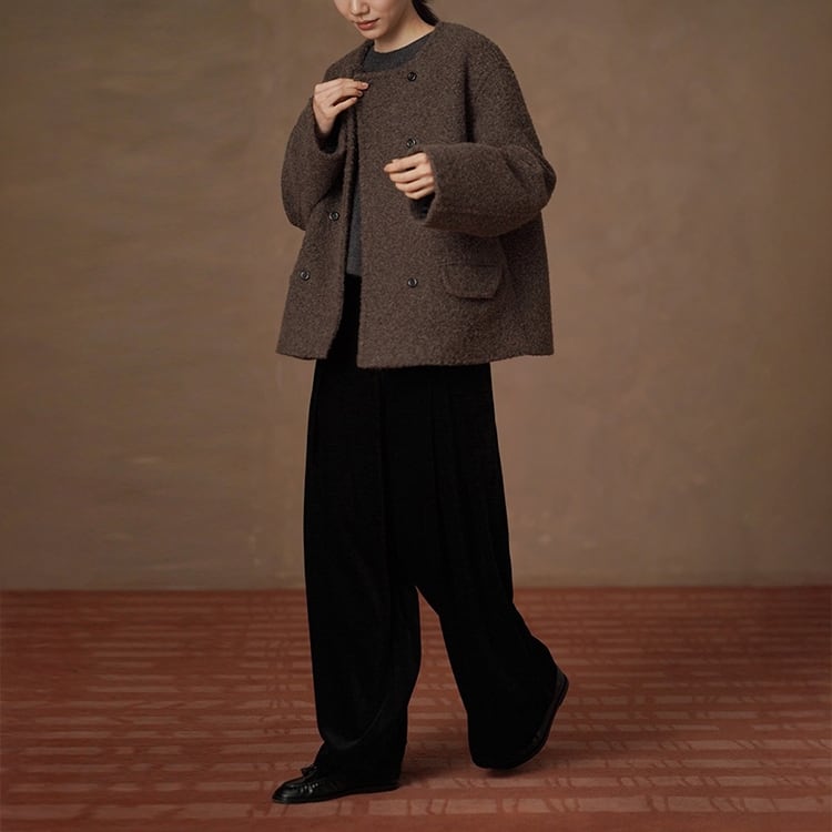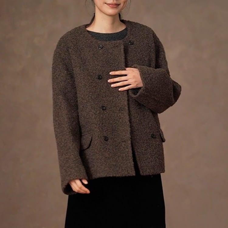 細かなループがあるブークレ調のウールライク素材を使用した、秋冬にぴったりのノーカラージャケット。丸首デザインは首元をすっきり見せ、タートルネックやクルーネックのニットとも相性抜群。ボリュームを抑えたシルエットで体型もすっきり見せられ、ダブルボタンがシンプルながらも洗練された印象に。きれいめにもカジュアルにも馴染む、万能アウターです。