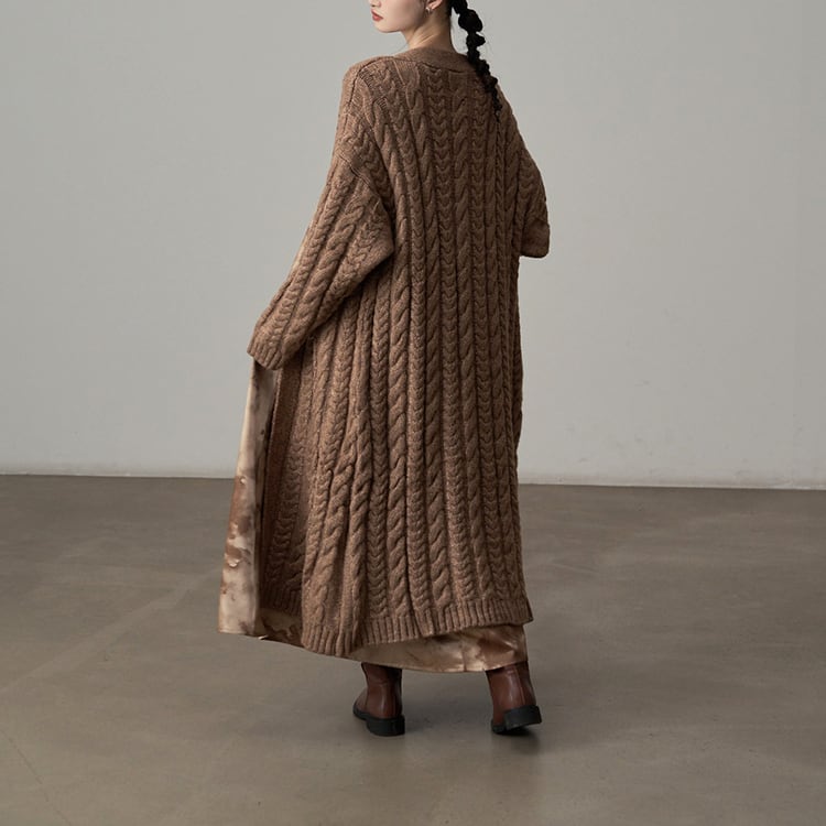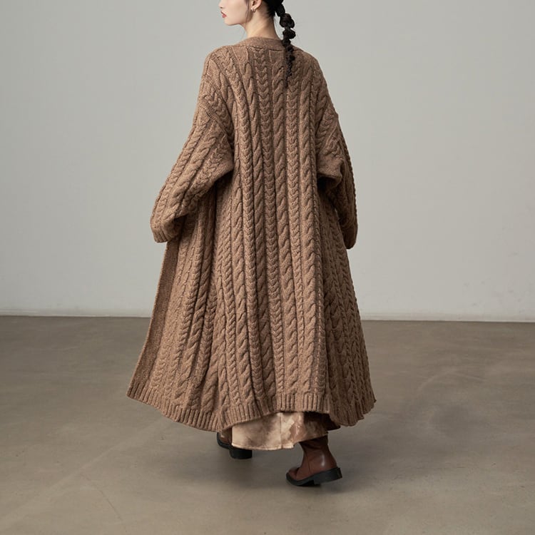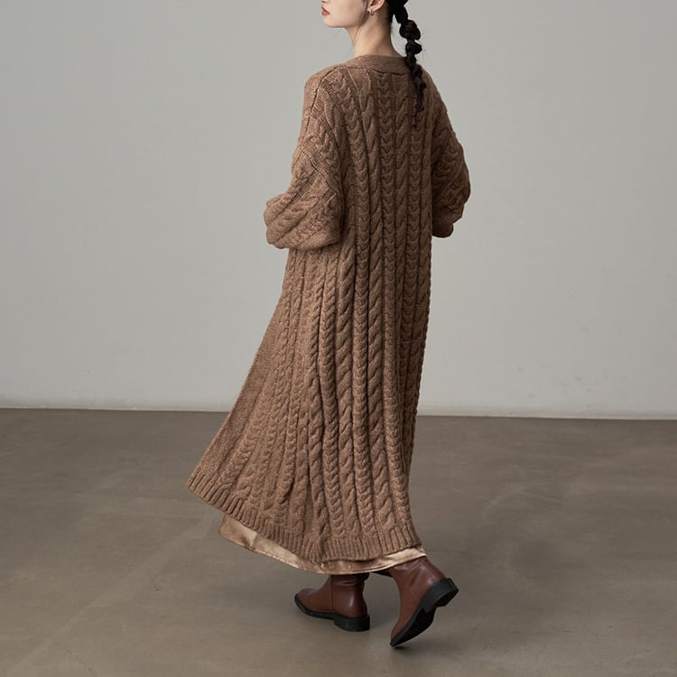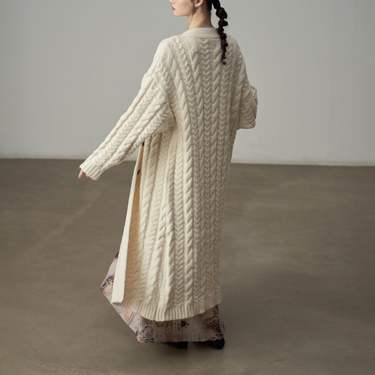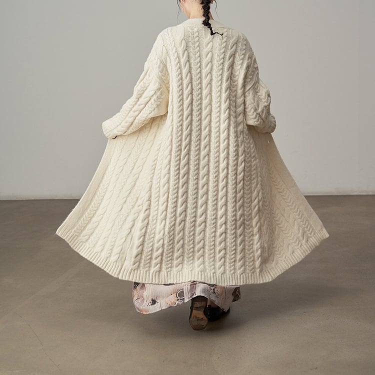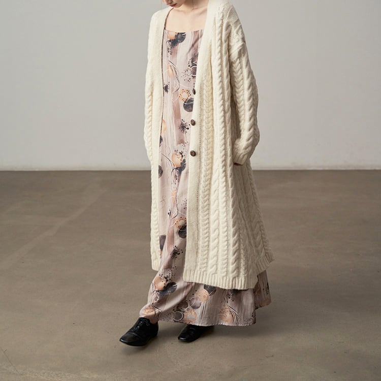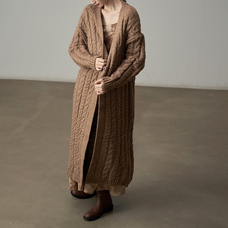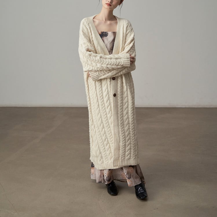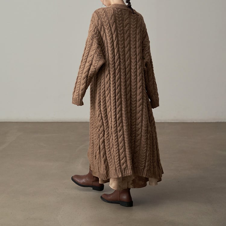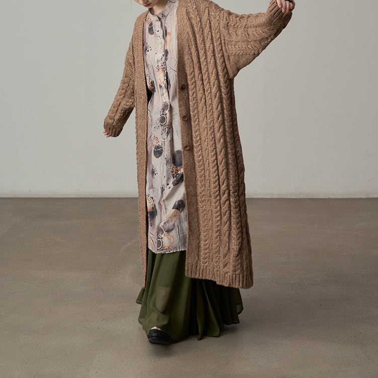 上品なケーブル編みが魅力のロングカーディガン。深めVネックと肩を落としたゆったりシルエットで、体型カバーしながら抜け感を演出。大人のこなれスタイルにぴったりな、ワンマイルウェアからタウンユースまで幅広く使えるアイテムです。