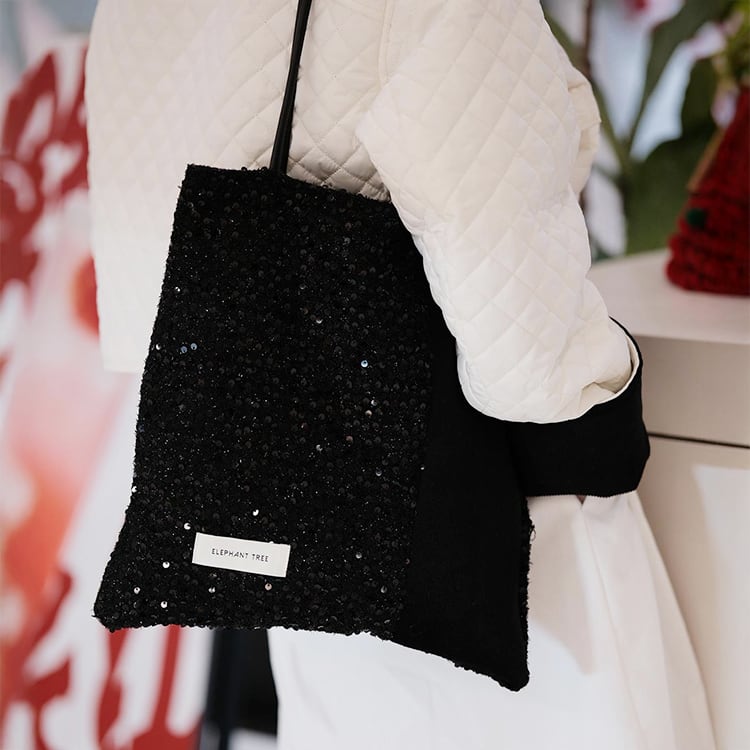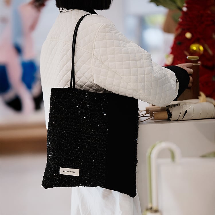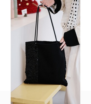上品に輝くスパンコールとベルベット調を組み合わせたショルダートート。絶妙なバランスの素材切替え、洗練されたデザインで、コーデのポイントとして華やかに魅せてくれます。シックなブラックカラーは、オンオフ問わず使える万能トートです。