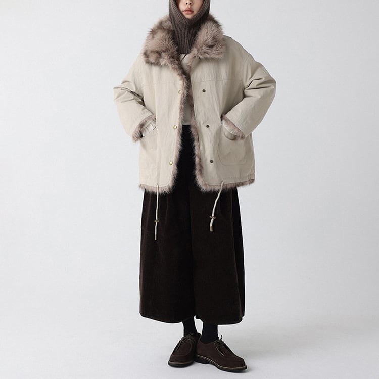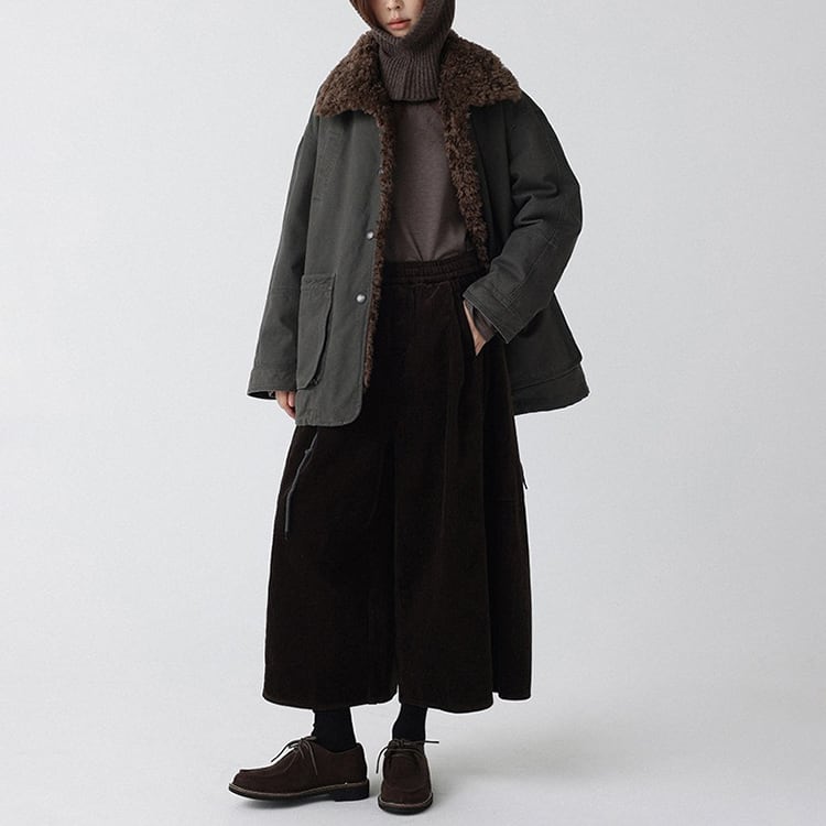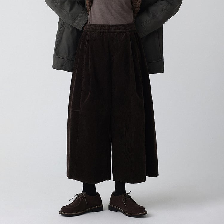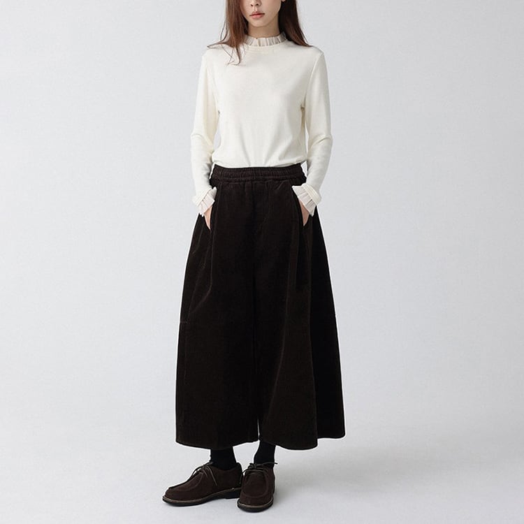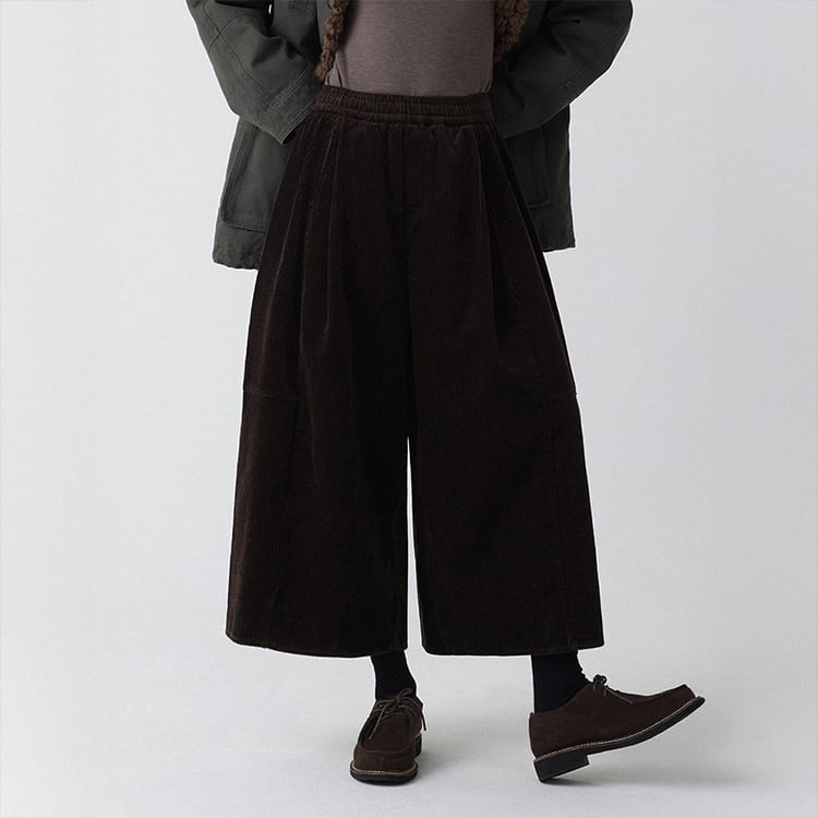 コーデュロイ素材を贅沢に使用した、冬にぴったりのワイドパンツ。足首が少し覗く8分丈で、重たく見えず抜け感のある印象。ウエストゴム仕様で締め付け感がなく、体型を選ばずリラックスした穿き心地。スカートのような見た目とパンツの動きやすさを兼ね備え、ブラウンカラーが秋冬の落ち着いたスタイリングを引き立てます。