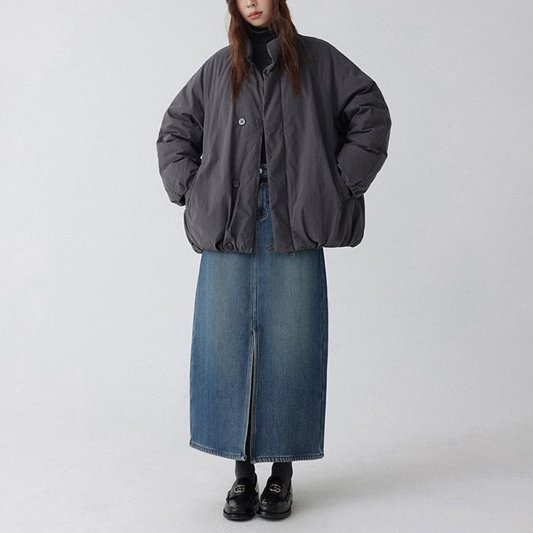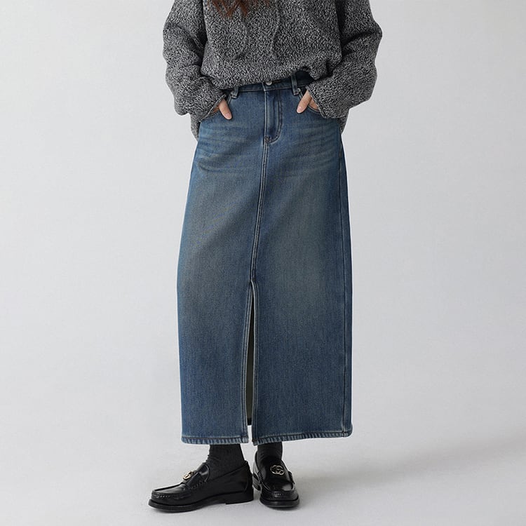 デニム生地に、裏起毛加工を施した暖か仕様のマキシ丈スカート。ストレートなIラインシルエットがすっきりとした印象を演出。前スリット入りで足さばきも良く、バックポケットが程よいアクセントとなり、秋冬の大人のカジュアルスタイルやデイリーコーデに一枚あると重宝するアイテムです。