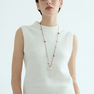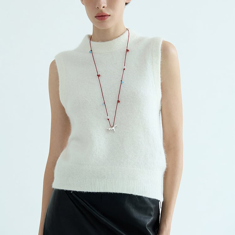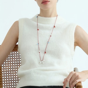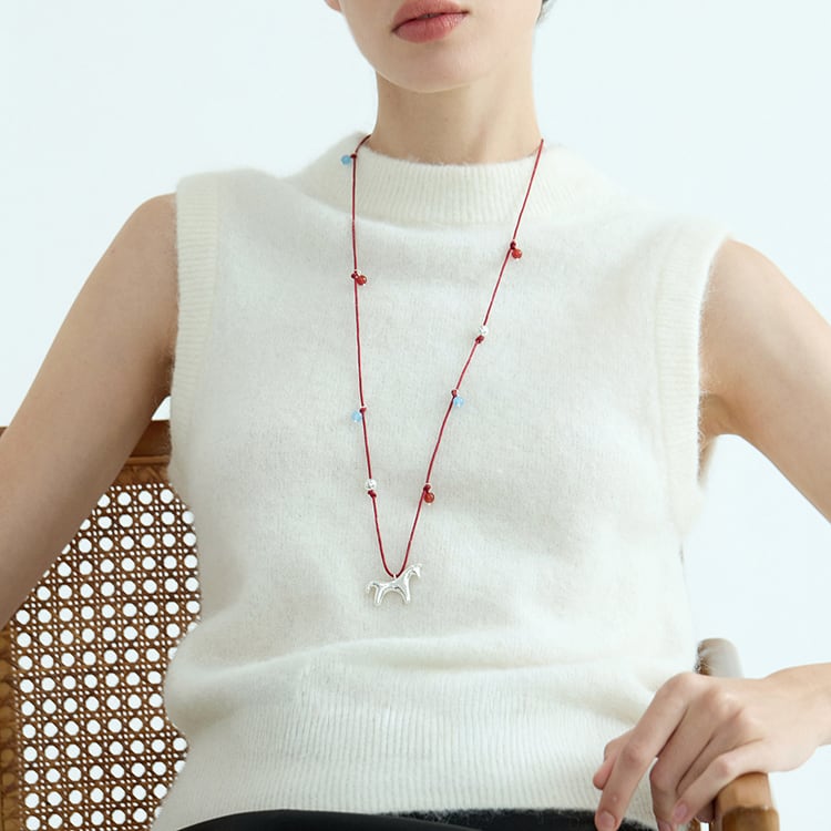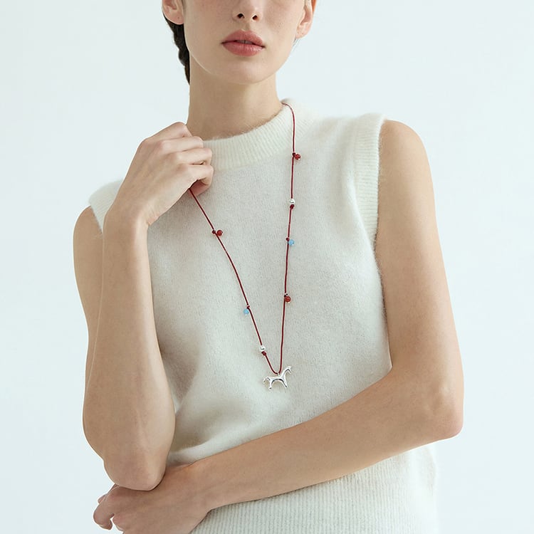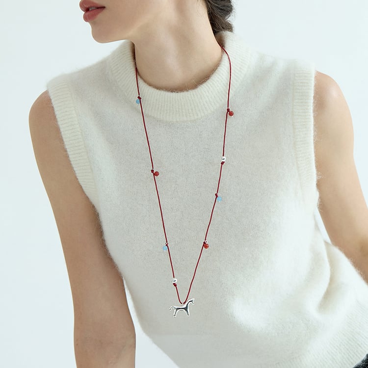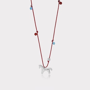 赤いコードにカラフルなガラスビーズと愛らしい馬チャームを組み合わせたロングネックレス。馬チャームはシルバーカラーで上品に仕上げ、カラービーズが遊び心をプラス。赤は縁起の良い色として親しまれ、来年の干支である馬チャーム。さりげなく縁起を取り入れたい方にぴったりのおすすめの一品です。