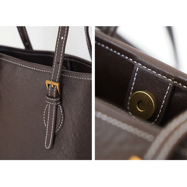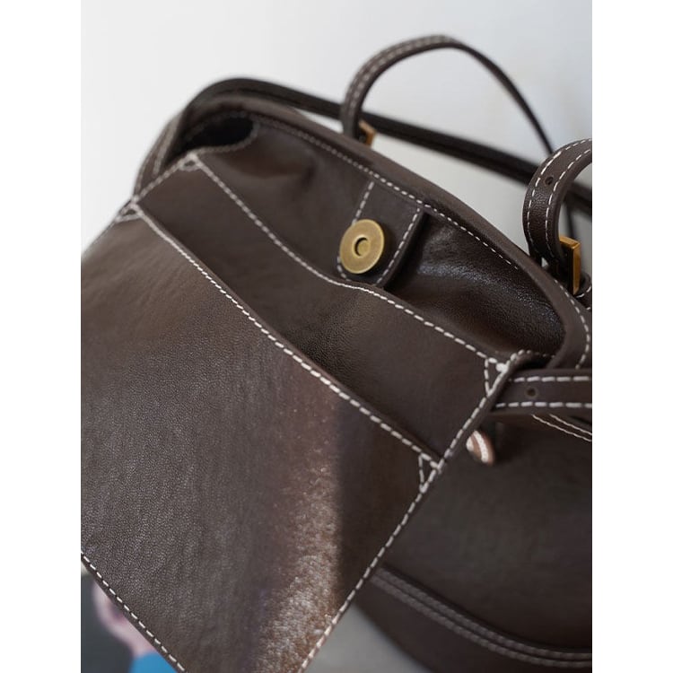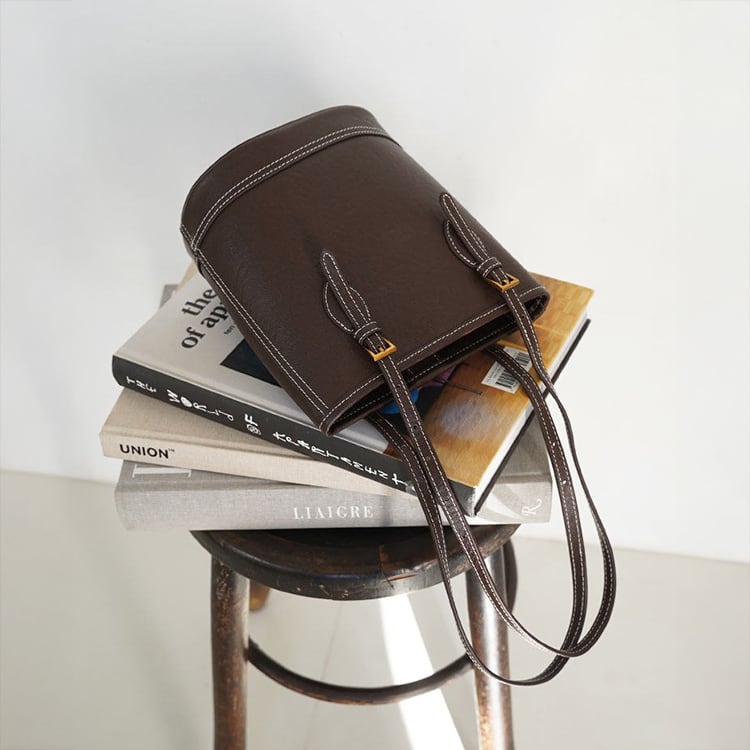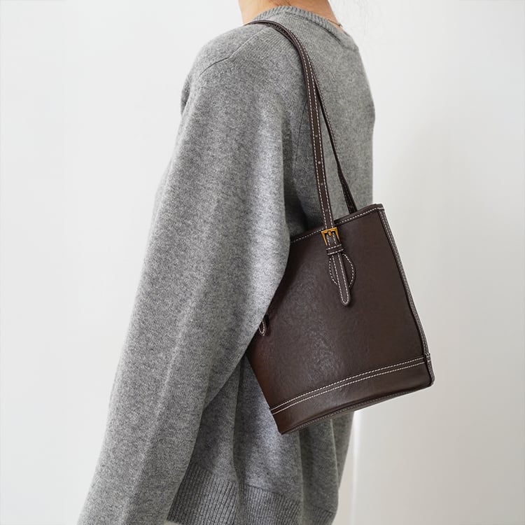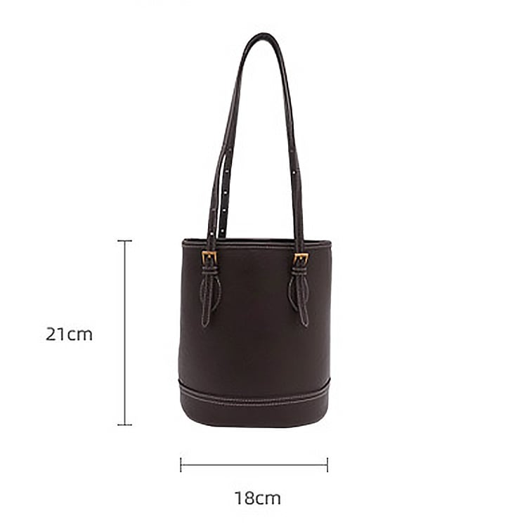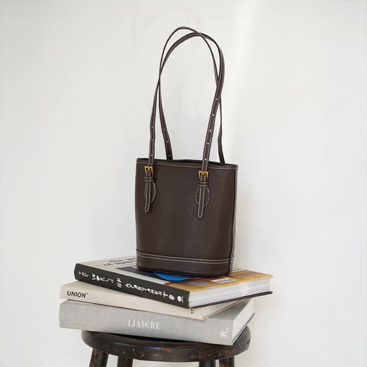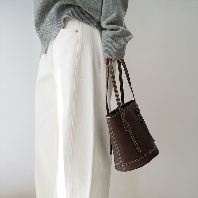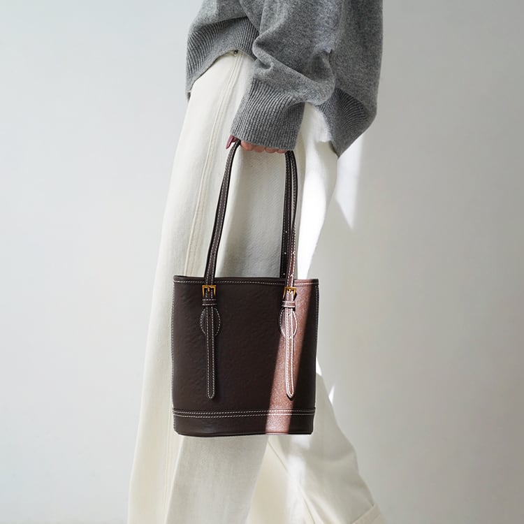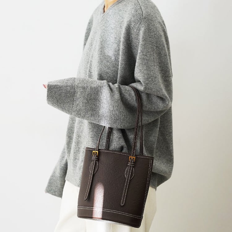 ミニマルデザインが魅力のバケツ型レザーバッグ。ステッチや金具使いが控えめなアクセントに。肩掛けしやすい調節可能なストラップで、通勤バッグとしても快適。実用性とデザイン性を兼ね備えた、毎日使いたくなる大人の女性にぴったりのバッグです。