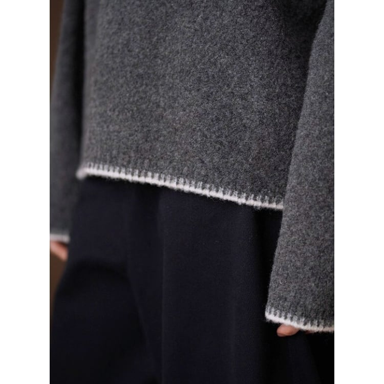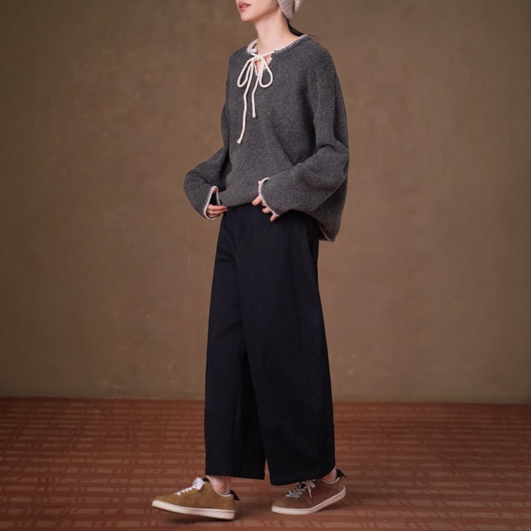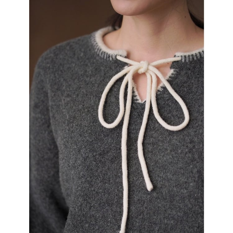 リボンとネック周りと袖口、裾に施されたステッチ風デザインが目を引くバイカラーVネックニット。ドロップショルダーが程よい抜け感を演出し、こなれた印象に仕上がります。暖かさと、デザイン性を兼ね備えた大人フェミニンなニットトップスです。