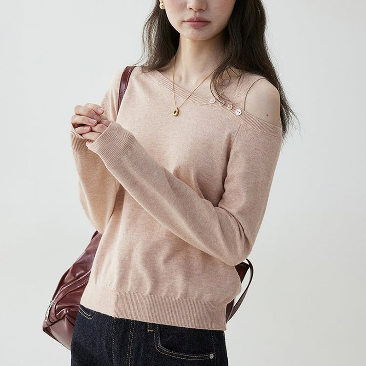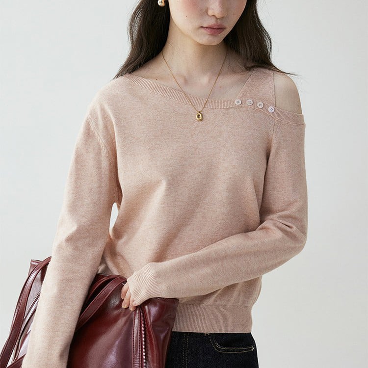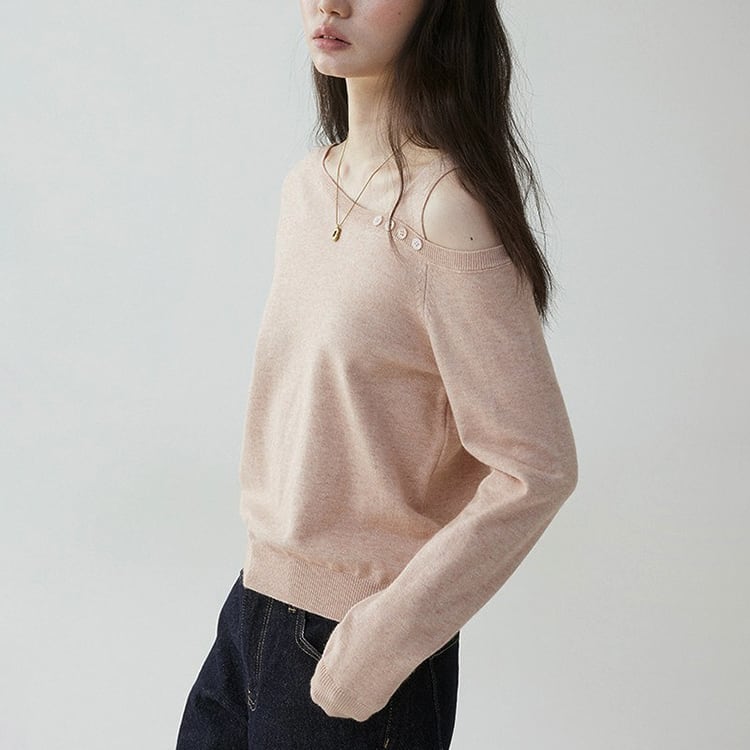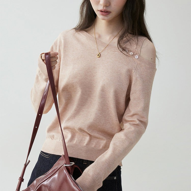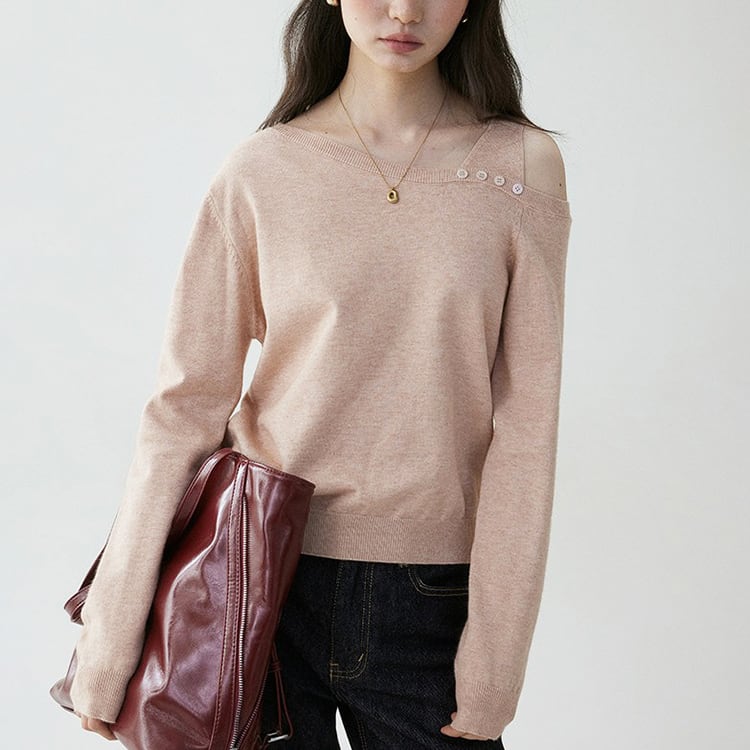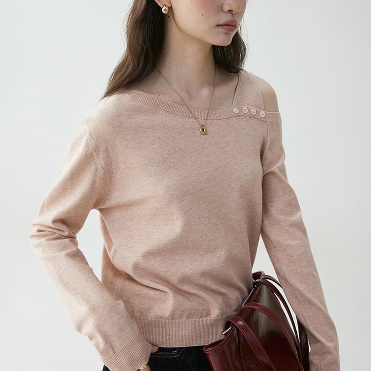 斜めにカットされた、アシンメトリーなネックラインが目を引く、こなれ感たっぷりのオフショル風ニット。ヘルシーな肌見せと、肩にあしらわれたボタンデザインがアクセントに。絶妙なゆるシルエットが、体のラインを拾わず細見えを叶えます。春の訪れを感じさせる、華やかな主役級トップスです。