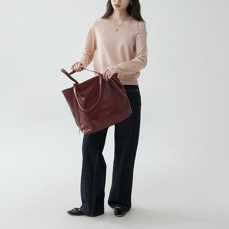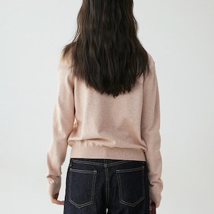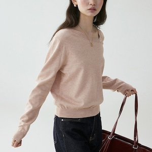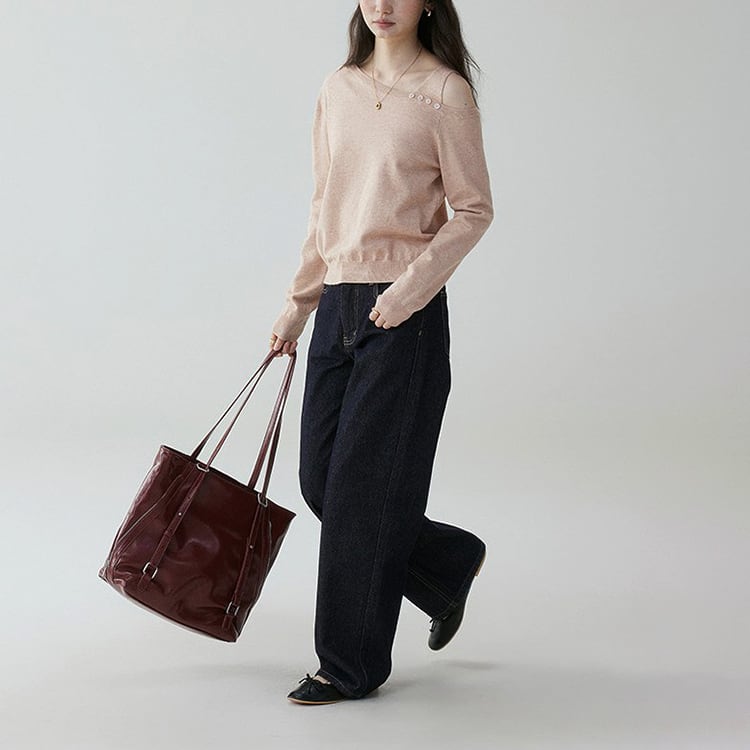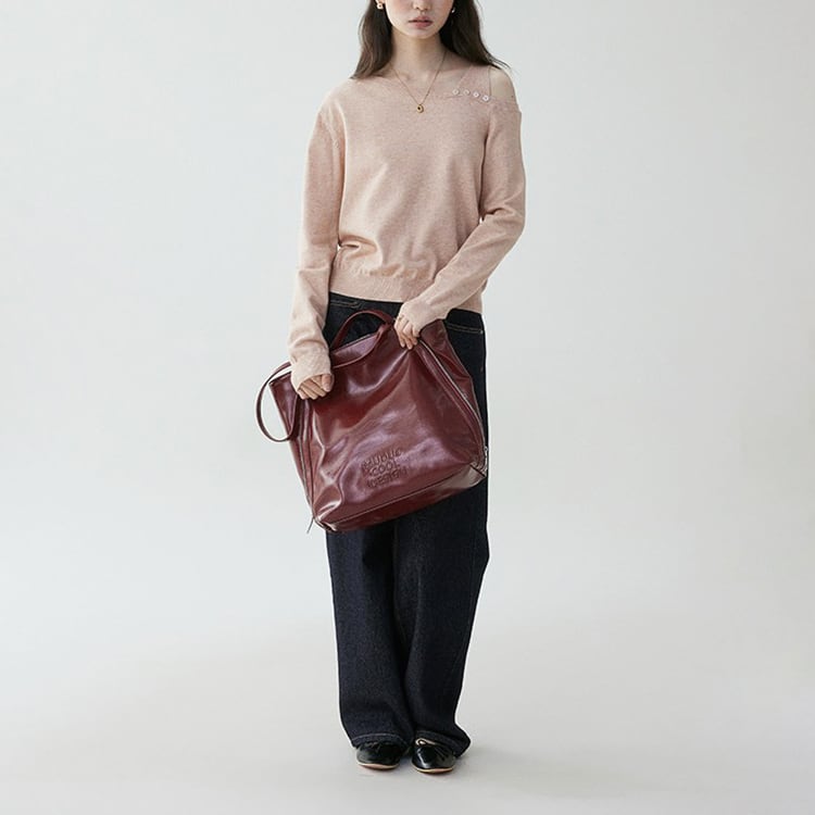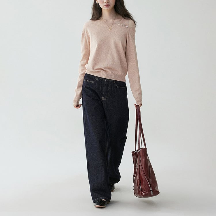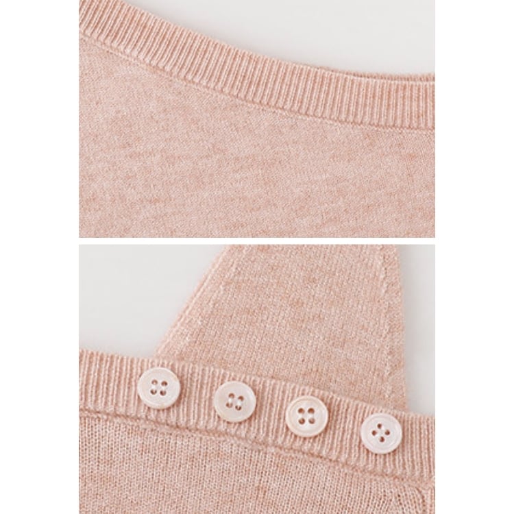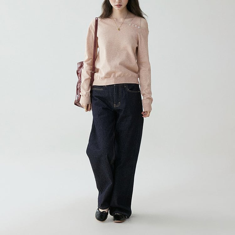 斜めにカットされた、アシンメトリーなネックラインが目を引く、こなれ感たっぷりのオフショル風ニット。ヘルシーな肌見せと、肩にあしらわれたボタンデザインがアクセントに。絶妙なゆるシルエットが、体のラインを拾わず細見えを叶えます。春の訪れを感じさせる、華やかな主役級トップスです。