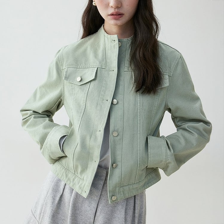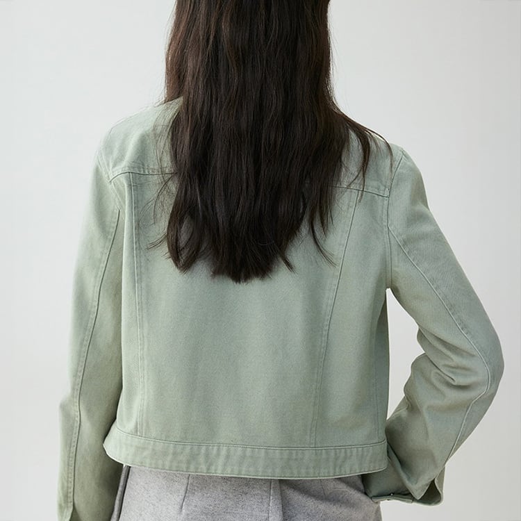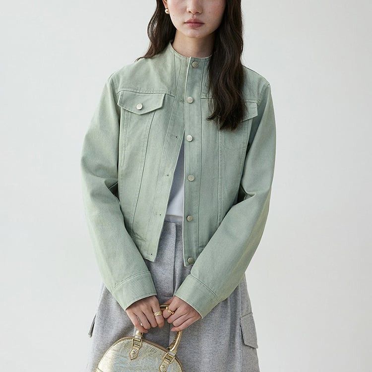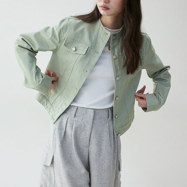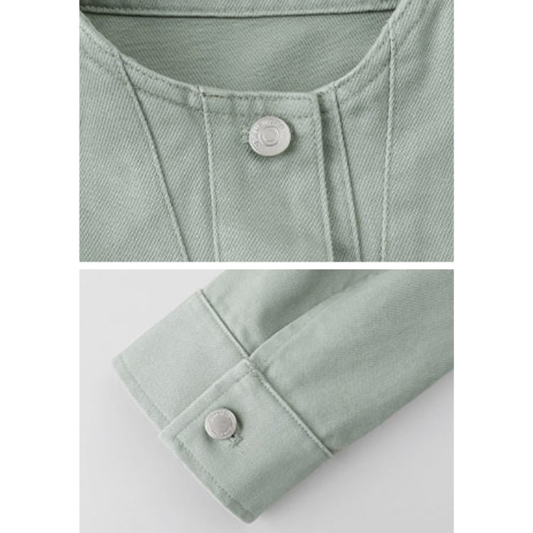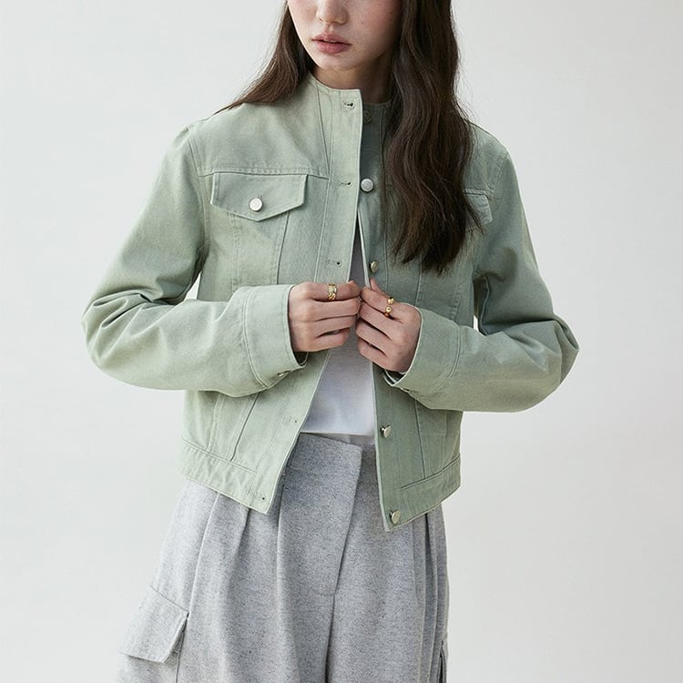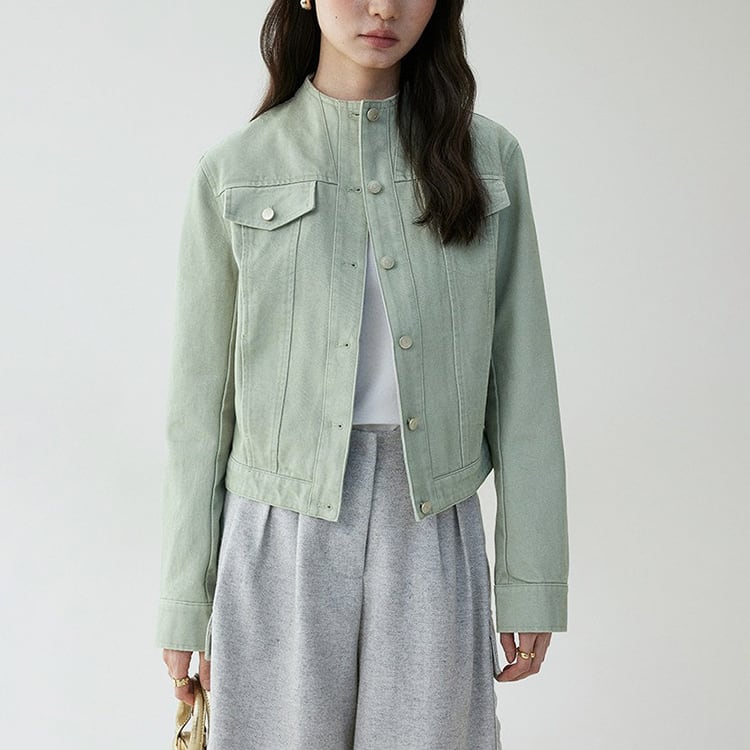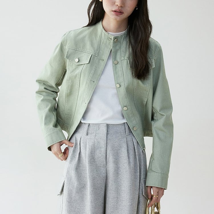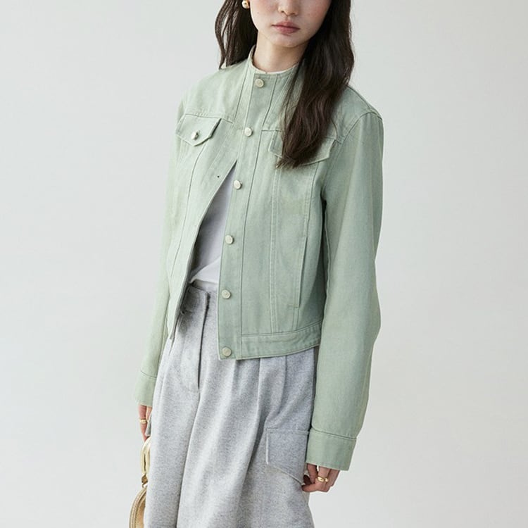 スタンドカラーが顔まわりをすっきりと見せてくれる、早春にぴったりのショート丈デニムジャケット。肩が落ちない美シルエット、上半身がコンパクト、自然な細見え効果が期待できます。立体感のあるスタンドカラーが大人っぽさを演出し、カジュアルながらもきちんと感のある、季節の変わり目に重宝するアイテムです。