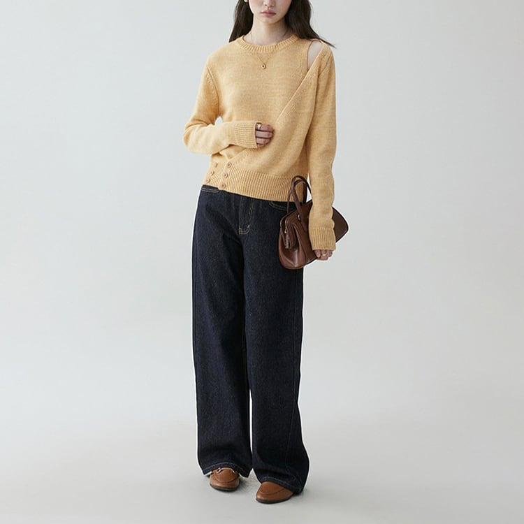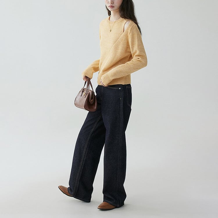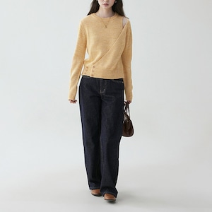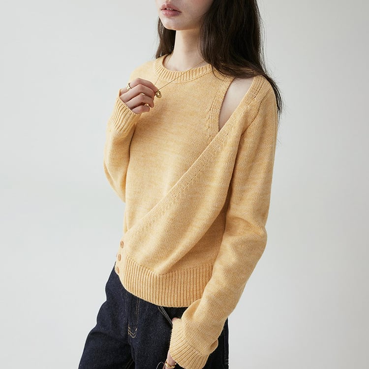 さりげないオフショルダー風デザインが目を惹く、デザイン性の高いクルーネックニット。露出を控えめにしたデザインなので、上品な肌見せが大人らしい抜け感を演出。ルーズフィットながら、リブ仕様の裾と袖口でシルエットを引き締めています。デザインで差がつく、大人カジュアルに映えるニットトップスです。