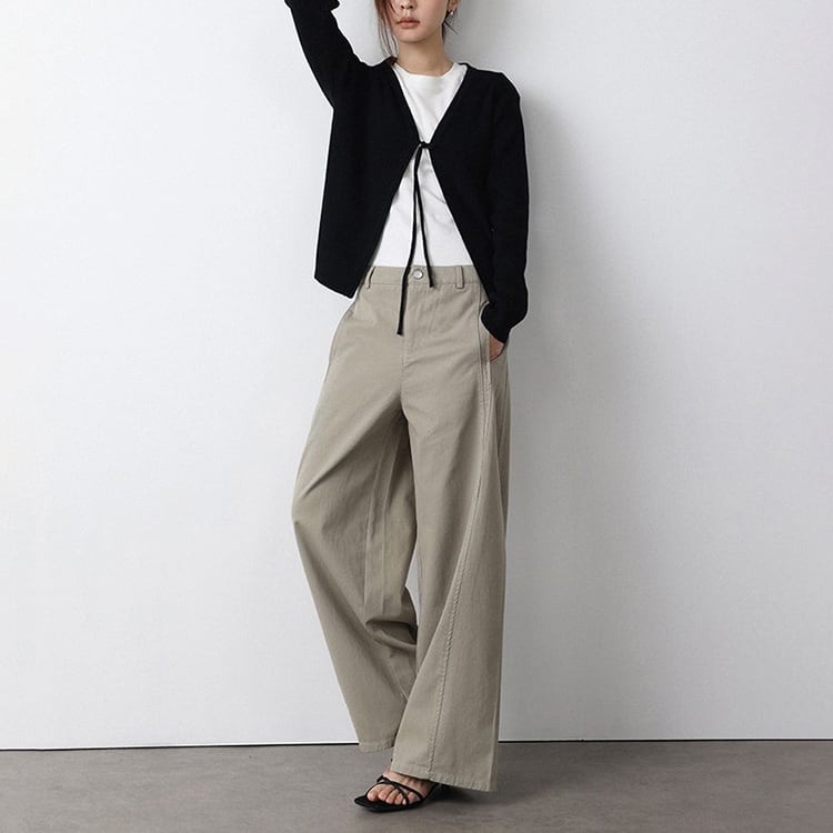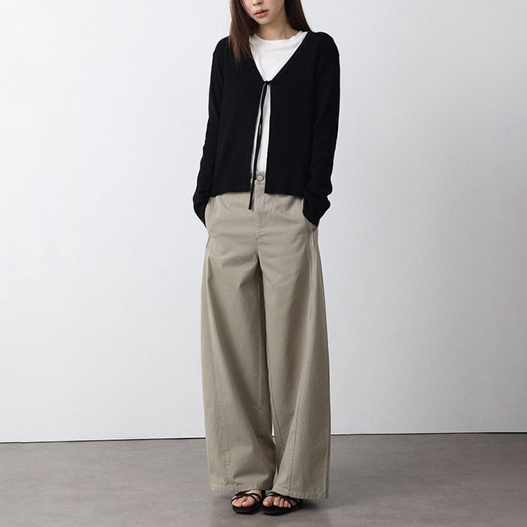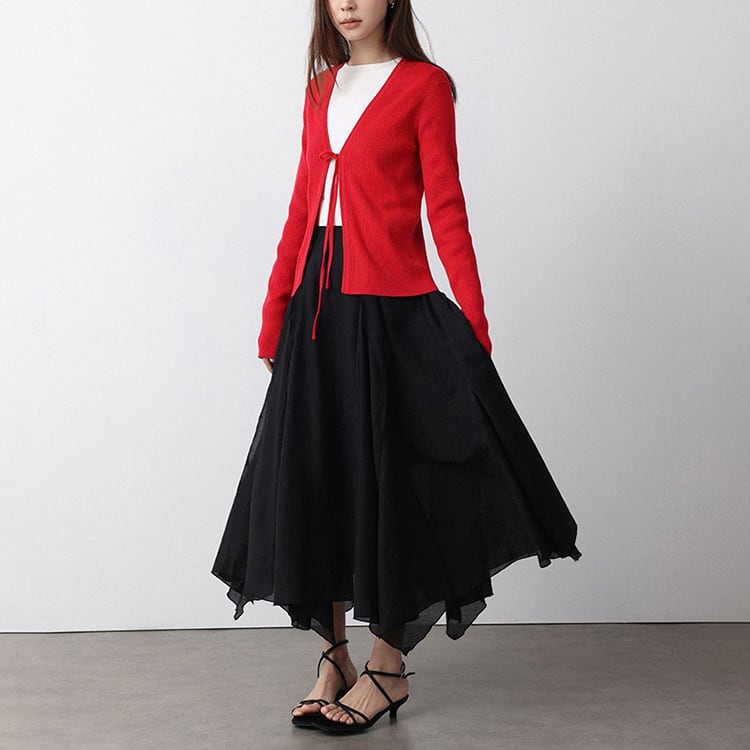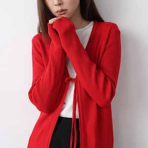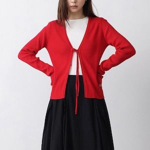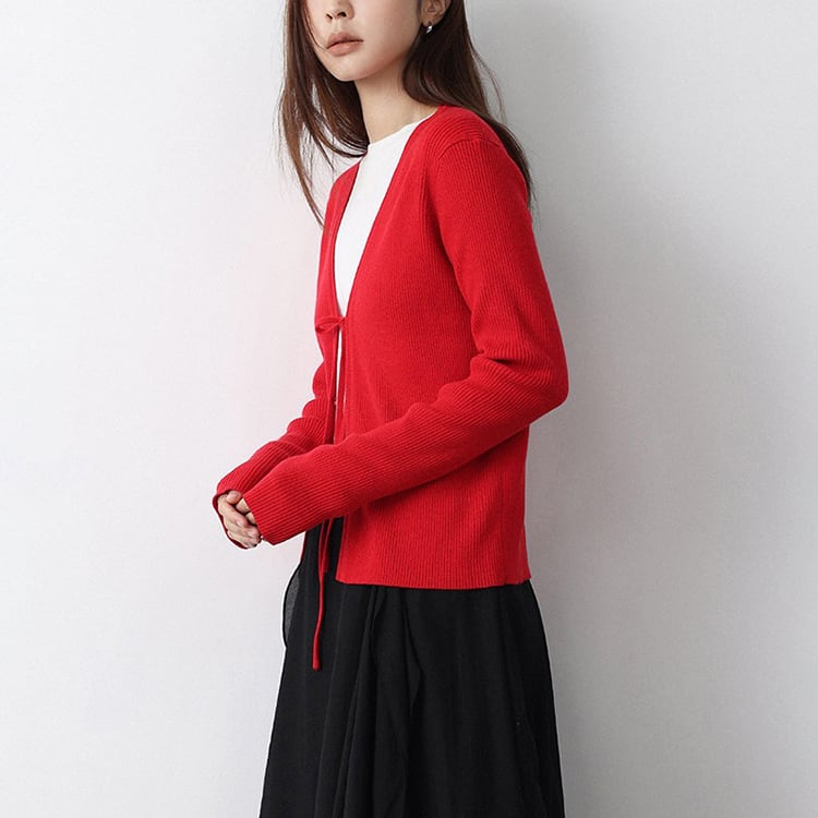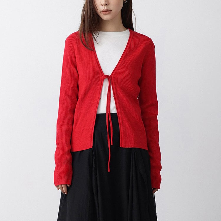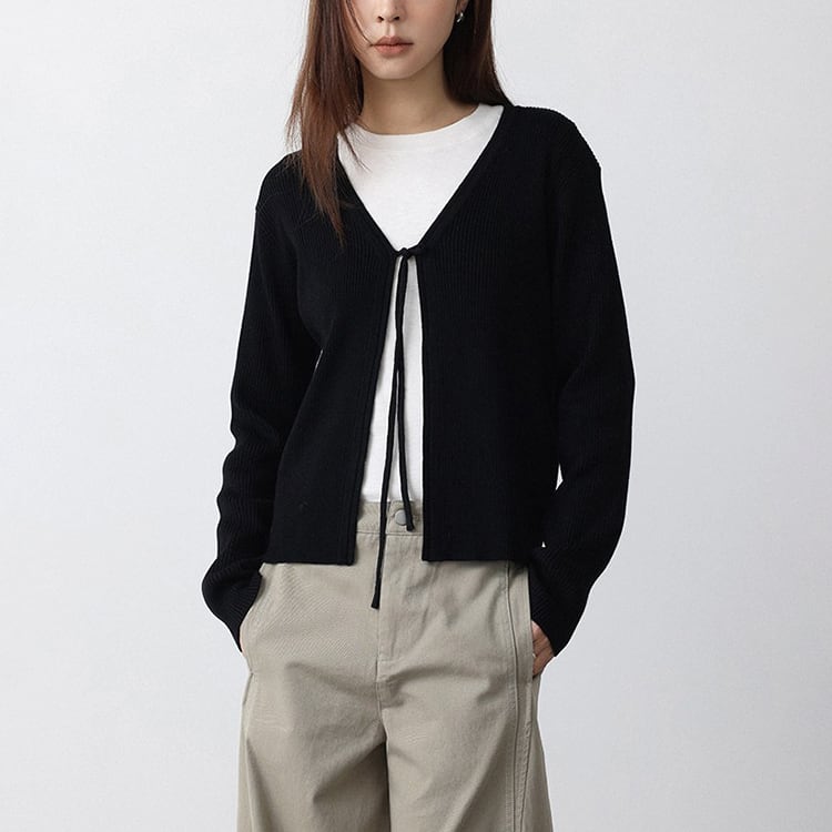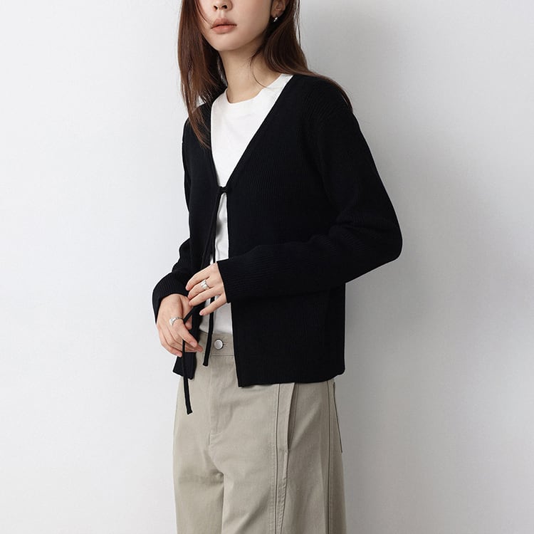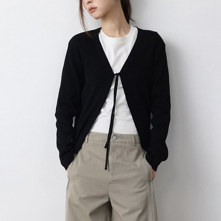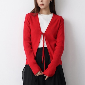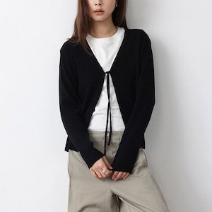 ミニマルなデザインのVネックニットカーディガン。フロントリボンデザインがさりげないアクセントになり、結ぶことで抜け感のある大人フェミニンな印象に仕上がります。インナー次第でロングシーズン着用できる万能アイテムです。