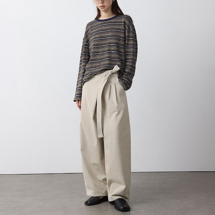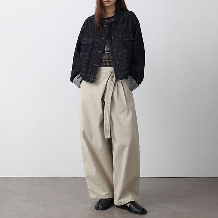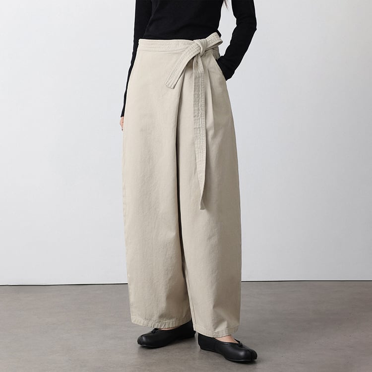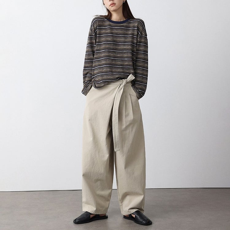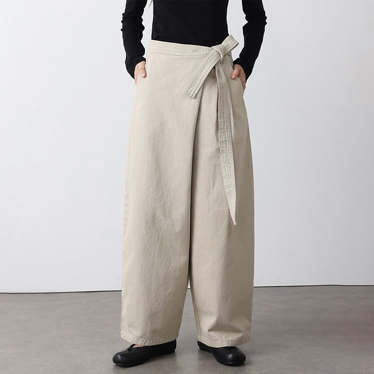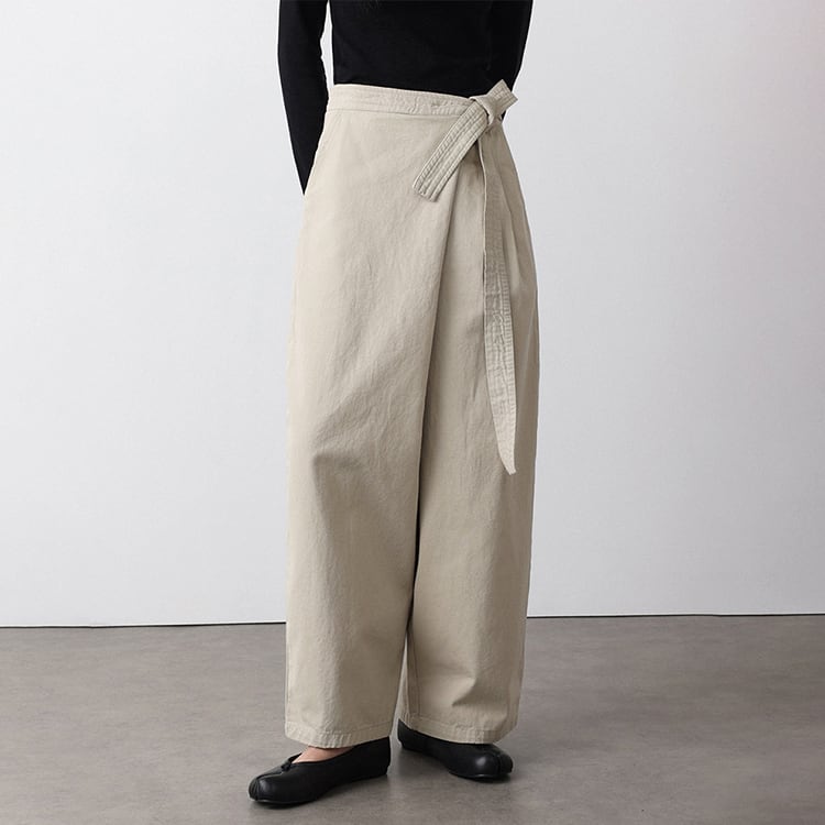 フロントのラップ風デザインが特徴のアンクル丈 (9分丈) のワイドパンツ。タックの縦ラインと高めのウエスト位置で結ぶリボンが、脚長効果を抜群に発揮。脚のラインを拾わないワイドシルエットに、アンクル丈で足首を見せることで抜け感を演出。洗いざらしのような風合いが心地よい、大人のためのコットンパンツです。 【サイズ】 S:ウエスト66cm / ヒップ105cm / 股上35cm / わたり73cm / 裾囲52cm / パンツ丈95cm M:ウエスト70cm / ヒップ109cm / 股上35.5cm / わたり75cm / 裾囲54cm / パンツ丈96cm L:ウエスト74cm / ヒップ113cm / 股上36cm / わたり77cm / 裾囲56cm / パンツ丈97cm *モデル身長168cm(Mサイズ着用) 【カラー】 ベージュ / ブラック 【素材】 コットン100% 【注意事項】 ・タイミングによっては商品在庫切れにより、注文キャンセルとさせていただく恐れもございますので、予めご了承くださいませ。 ・こちらは輸入品となります。日本製とは検品基準が異なる為、新品未使用品でもごくわずかな汚れやほつれがある場合もございます。 ・仕入れ工場を変えることがあるため、記載サイズと若干異なる場合がございます。 ・商品の色味は、お手持ちのスマートフォン画面によって実物と若干異なる場合がございます。 ・イメージ違いやサイズ交換等、お客さまご都合による交換、返品は対応出来かねます。 ■選べるお支払い方法 ・クレジットカード決済(VISA/Master/JCB/AMEX) ・Amazon pay ・キャリア決済(docomo/au/Softbank/Y!mobile) ・あと払いPayID ■お届けについて こちらの商品は海外店舗より直接発送となる為、 ご入金から10日~3週間前後での発送となります。 ↓ご購入前にこちらをお読みください https://closetly.shopselect.net/about